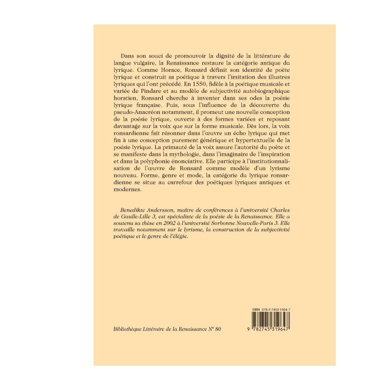 Dans son souci de promouvoir la dignité de la littérature de langue vulgaire, la Renaissance restaure la catégorie antique du lyrique. Comme Horace, Ronsard définit son identité de poète lyrique et construit sa poétique à travers l`imitation des illustres lyriques qui l`ont précédé. En 1550, fidèle à la poétique musicale et variée de Pindare et au modèle de subjectivité autobiographique horatien, Ronsard cherche à inventer dans ses odes la poésie lyrique française. Puis, sous l`influence de la découverte du pseudo-Anacréon notamment, il promeut une nouvelle conception de la poésie lyrique, ouverte à des formes variées et reposant davantage sur la voix que sur la forme musicale. Dès lors, la voix ronsardienne fait résonner dans l`œuvre un écho lyrique qui met fin à une conception purement générique et hypertextuelle de la poésie lyrique. La primauté de la voix assure l`autorité du poète et se manifeste dans la mythologie, dans l`imaginaire de l`inspiration et dans la polyphonie énonciative. Elle participe à l`institutionnalisation de l`œuvre de Ronsard comme modèle d`un lyrisme nouveau. Forme, genre et mode, la catégorie du lyrique ronsardienne se situe au carrefour des poétiques lyriques antiques et modernes. Benedikte Andersson, maître de conférences à l`université Charles de Gaulle-Lille 3, est spécialiste de la poésie de la Renaissance. Elle a soutenu sa thèse en 2002 à l`université Sorbonne Nouvelle-Paris 3. Elle travaille notamment sur le lyrisme, la construction de la subjectivité poétique et le genre de l`élégie.