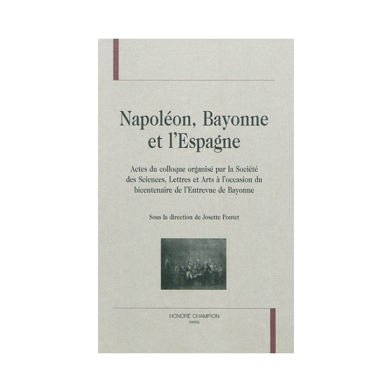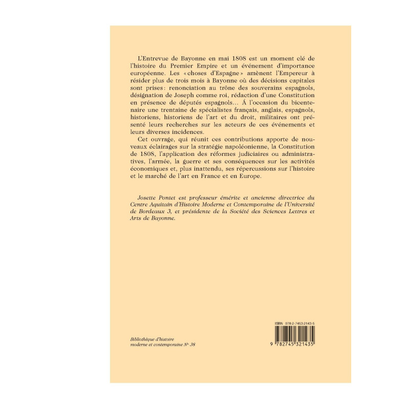 L`Entrevue de Bayonne en mai 1808 est un moment clé de l`histoire du Premier Empire et un événement d`importance européenne. Les " choses d`Espagne " amènent l`Empereur à résider plus de trois mois à Bayonne où des décisions capitales sont prises : renonciation au trône des souverains espagnols, désignation de Joseph comme roi, rédaction d`une Constitution en présence de députés espagnols… Á l`occasion du bicentenaire une trentaine de spécialistes français, anglais, espagnols, historiens, historiens de l`art et du droit, militaires ont présenté leurs recherches sur les acteurs de ces événements et leurs diverses incidences. Cet ouvrage, qui réunit ces contributions apporte de nouveaux éclairages sur la stratégie napoléonienne, la Constitution de 1808, l`application des réformes judiciaires ou administratives, l`armée, la guerre et ses conséquences sur les activités économiques et, plus inattendu, ses répercussions sur l`histoire et le marché de l`art en France et en Europe. Josette Pontet est professeur émérite et ancienne directrice du Centre Aquitain d`Histoire Moderne et Contemporaine de l`Université de Bordeaux 3, et présidente de la Société des Sciences Lettres et Arts de Bayonne.