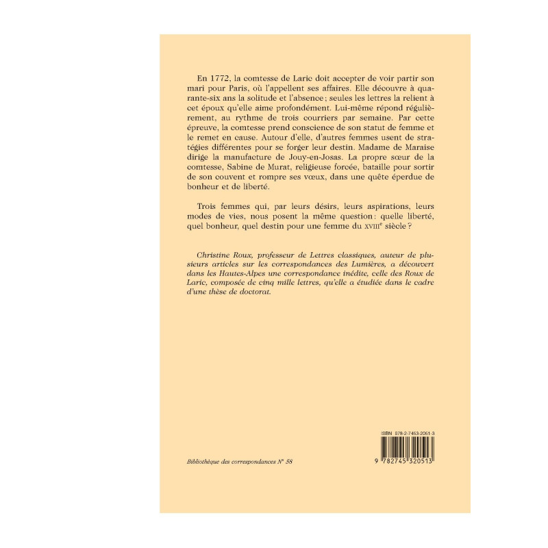 En 1772, la comtesse de Laric doit accepter de voir partir son mari pour Paris, où l`appellent ses affaires. Elle découvre à quarante- six ans la solitude et l`absence ; seules les lettres la relient à cet époux qu`elle aime profondément. Lui-même répond régulièrement, au rythme de trois courriers par semaine. Par cette épreuve, la comtesse prend conscience de son statut de femme et le remet en cause. Autour d`elle, d`autres femmes usent de stratégies différentes pour se forger leur destin. Madame de Maraise dirige la manufacture de Jouy-en-Josas. La propre sœur de la comtesse, Sabine de Murat, religieuse forcée, bataille pour sortir de son couvent et rompre ses vœux, dans une quête éperdue de bonheur et de liberté. Trois femmes qui, par leurs désirs, leurs aspirations, leurs modes de vies, nous posent la même question : quelle liberté, quel bonheur, quel destin pour une femme du XVIIIe siècle? Christine Roux, professeur de Lettres classiques, auteur de plusieurs articles sur les correspondances des Lumières, a découvert dans les Hautes-Alpes une correspondance inédite, celle des Roux de Laric, composée de cinq mille lettres, qu`elle a étudiée dans le cadre d`une thèse de doctorat.
