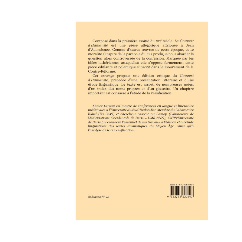 Composé dans la première moitié du XVIe siècle, Le Gouvert d`Humanité est une pièce allégorique attribuée à Jean d`Adondance. Comme d`autres œuvres de cette époque, cette moralité s`inspire de la parabole du Fils prodigue pour aborder la question alors controversée de la confession. Marquée par les idées luthériennes auxquelles elle s`oppose fermement, cette pièce édifiante et polémique s`inscrit dans le mouvement de la Contre-Réforme. Cet ouvrage propose une édition critique du Gouvert d`Humanité, précédée d`une présentation littéraire et d`une étude linguistique. Le texte est assorti de nombreuses notes, d`un index des noms propres et d`un glossaire. Un chapitre important est consacré à l`étude de la versification. Xavier Leroux est maître de conférences en langue et littérature médiévales à l`Université du Sud Toulon-Var. Membre du Laboratoire Babel (EA 2649) et chercheur associé au Lamop (Laboratoire de Médiévistique Occidentale de Paris - UMR 8589), CNRS/Université de Paris I, il consacre l`essentiel de ses travaux à l`édition et à l`étude linguistique des textes dramatiques du Moyen Âge, ainsi qu`à l`analyse de leur versification.