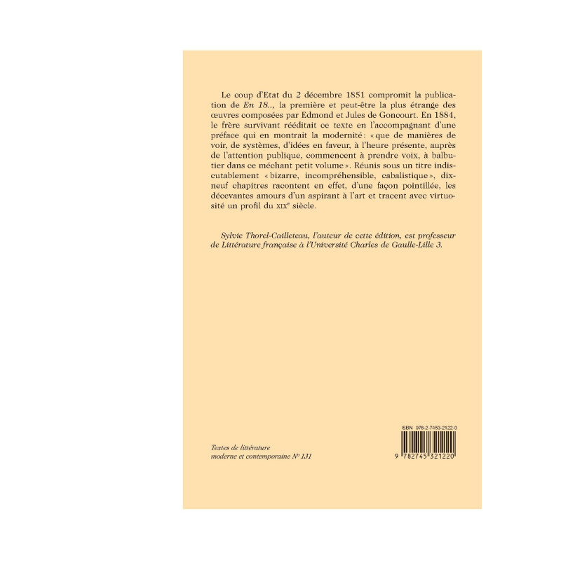 Le coup d`Etat du 2 décembre 1851 compromit la publication de En 18.., la première et peut-être la plus étrange des œuvres composées par Edmond et Jules de Goncourt. En 1884, le frère survivant rééditait ce texte en l`accompagnant d`une préface qui en montrait la modernité : "que de manières de voir, de systèmes, d`idées en faveur, à l`heure présente, auprès de l`attention publique, commencent à prendre voix, à balbutier dans ce méchant petit volume ". Réunis sous un titre indiscutablement " bizarre, incompréhensible, cabalistique ", dix-neuf chapitres racontent en effet, d`une façon pointillée, les décevantes amours d`un aspirant à l`art et tracent avec virtuosité un profil du XIXe siècle. Sylvie Thorel-Cailleteau, l`auteur de cette édition, est professeur de Littérature française à l`Université Charles de Gaulle-Lille 3.