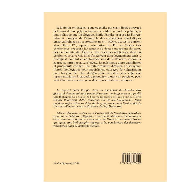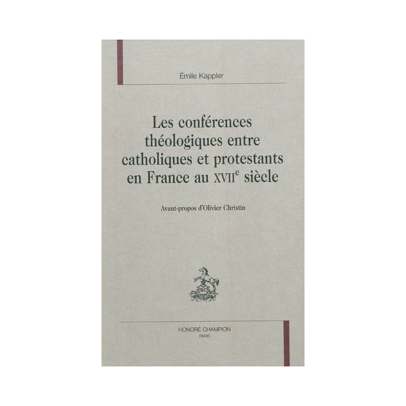 À la fin du XVIe siècle, la guerre civile, qui avait divisé et ravagé la France durant près de trente ans, cédait le pas à la polémique tant politique que théologique. Emile Kappler propose ici l`inventaire et l`analyse de l`ensemble des conférences théologiques entre catholiques et protestants au XVIIe siècle, depuis la conversion d`Henri IV jusqu`à la révocation de l`Edit de Nantes. Ces conférences opposent les tenants de deux conceptions du salut, des sacrements, de l`Église et des pratiques religieuses, dans un combat pour la vérité. Elles s`inscrivent donc logiquement dans le prodigieux courant de controverse issu de la Réforme, et dont la source ne tarit pas au XVIIe siècle. La polémique entre catholiques et protestants connaît une extraordinaire diffusion en français : traités théologiques pour spécialistes, ouvrages de vulgarisation pour les gens de robe, abrégés pour un public plus large, dialogues satiriques à caractère populaire, parfois en patois et pouvant être mis en scène pour des représentations publiques. Le regretté Emile Kappler était un spécialiste de l`histoire religieuse ; il s`intéressait tout particulièrement aux huguenots et a publié une Bibliographie critique de l`œuvre imprimée de Pierre Jurieu (Paris Honoré Champion, 2002 : collection " la Vie des huguenots "). Nous publions aujourd`hui sa thèse de 3e cycle, soutenue à l`université de Clermont-Ferrand sous la direction de Guy Demerson. Olivier Christin, professeur à l`université de Neuchâtel, spécialiste reconnu de l`histoire religieuse et tout particulièrement de la controverse entre catholiques et protestants, est l`auteur d`un Avant-Propos qui ajoute une bibliographie récente et les conclusions des dernières recherches dans ce domaine d`étude.