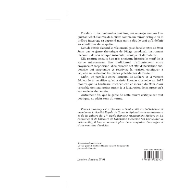 Au lieu de chercher en vain à définir la position (indécidable) défendue par la pièce la plus énigmatique de Molière, l`ouvrage ici réédité adopte une position de surplomb sur ce débat: considérer Dom Juan comme un miroir critique où la comédie interroge sa capacité non plus à dire le vrai, mais à définir les conditions de sa quête à la faveur d`un suspens du sens. À quoi auront contribué un tour d`origine oratoire, celui de l`éloge paradoxal, un motif légendaire immémorial, celui de la statue miraculeuse, et une alacrité d`écriture que met en valeur le parallèle avec la version versifiée procurée par Thomas Corneille (1677).