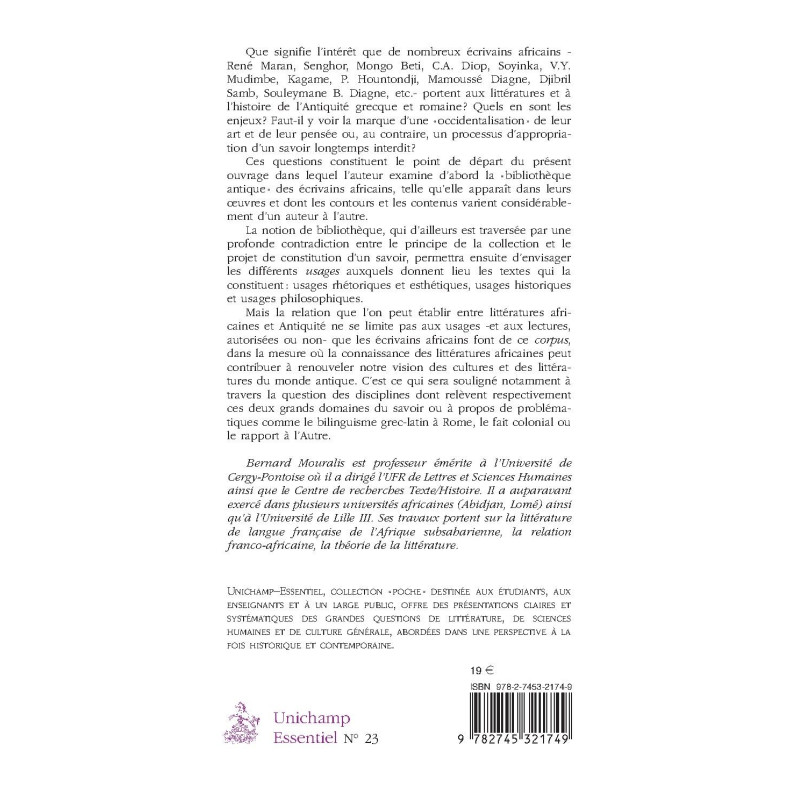 Que signifie l’intérêt que de nombreux écrivains africains – René Maran, Senghor, Mongo Beti, C.A. Diop, Soyinka, V.Y. Mudimbe, Kagame, P. Hountondji, Mamoussé Diagne, Djibril Samb, Souleymane B. Diagne, etc. – portent aux littératures et à l’histoire de l’Antiquité grecque et romaine ? Quels en sont les enjeux ? Faut-il y voir la marque d’une « occidentalisation » de leur art et de leur pensée ou, au contraire, un processus d’appropriation d’un savoir longtemps interdit ?Ces questions constituent le point de départ du présent ouvrage dans lequel l’auteur examine d’abord la « bibliothèque antique » des écrivains africains, telle qu’elle apparaît dans leurs œuvres et dont les contours et les contenus varient considérablement d’un auteur à l’autre. La relation que l’on peut établir entre littératures africaines et Antiquité ne se limite pas aux usages – et aux lectures, autorisées ou non – que les écrivains africains font de ce corpus, dans la mesure où la connaissance des littératures africaines peut contribuer à renouveler notre vision des cultures et des littératures du monde antique.