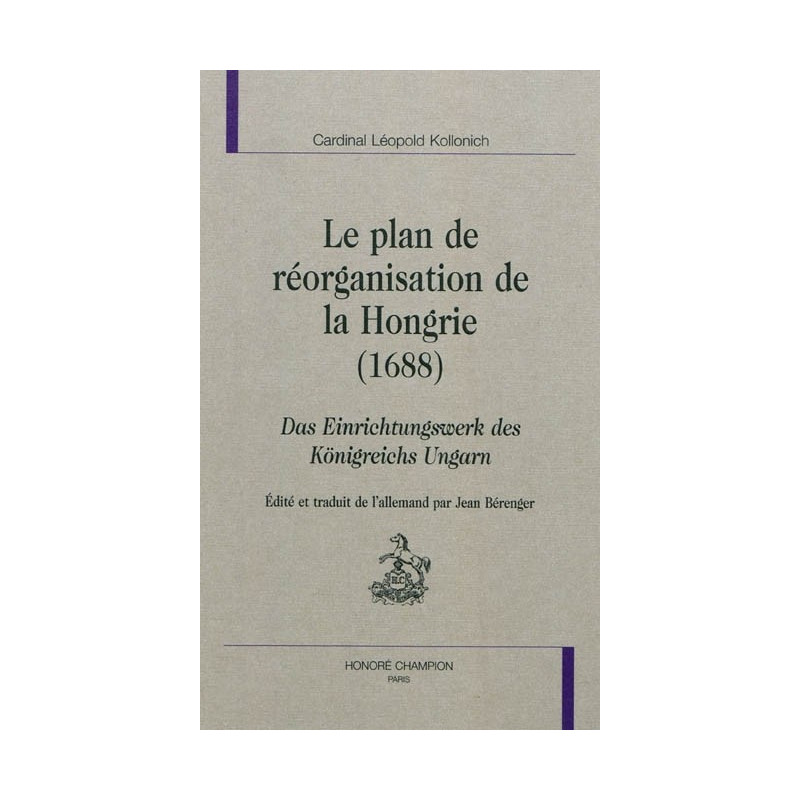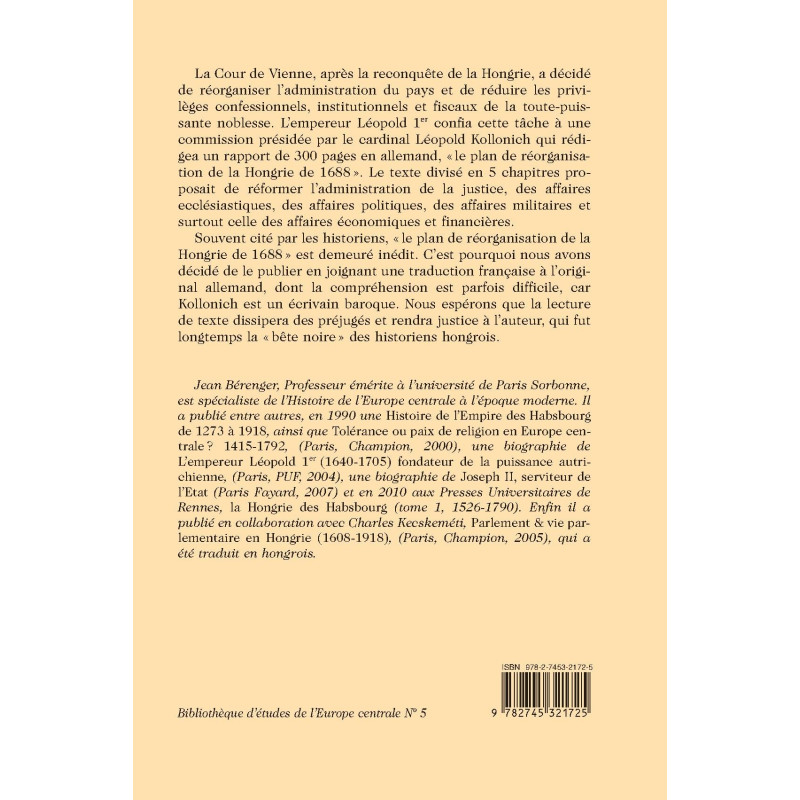 La Cour de Vienne, après la reconquête de la Hongrie, a décidé de réorganiser l`administration du pays et de réduire les privilèges confessionnels, institutionnels et fiscaux de la toute-puissante noblesse. L`empereur Léopold 1er confia cette tâche à une commission présidée par le cardinal Léopold Kollonich qui rédigea un rapport de 300 pages en allemand, " le plan de réorganisation de la Hongrie de 1688 ". Le texte divisé en 5 chapitres proposait de réformer l`administration de la justice, des affaires ecclésiastiques, des affaires politiques, des affaires militaires et surtout celle des affaires économiques et financières. Souvent cité par les historiens, " le plan de réorganisation de la Hongrie de 1688 " est demeuré inédit. C`est pourquoi nous avons décidé de le publier en joignant une traduction française à l`original allemand, dont la compréhension est parfois difficile, car Kollonich est un écrivain baroque. Nous espérons que la lecture de texte dissipera des préjugés et rendra justice à l`auteur, qui fut longtemps la "bête noire " des historiens hongrois. Jean Bérenger, Professeur émérite à l`université de Paris Sorbonne, est spécialiste de l`Histoire de l`Europe centrale à l`époque moderne. Il a publié entre autres, en 1990 une Histoire de l`Empire des Habsbourg de 1273 à 1918, ainsi que Tolérance ou paix de religion en Europe centrale? 1415-1792, (Paris, Champion, 2000), une biographie de L`empereur Léopold 1er (1640-1705) fondateur de la puissance autrichienne, (Paris, PUF, 2004), une biographie de Joseph II, serviteur de l`Etat (Paris Fayard, 2007) et en 2010 aux Presses Universitaires de Rennes, la Hongrie des Habsbourg (tome 1, 1526-1790). Enfin il a publié en collaboration avec Charles Kecskeméti, Parlement & vie parlementaire en Hongrie (1608-1918), (Paris, Champion, 2005), qui a été traduit en hongrois.