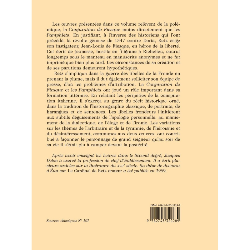 Les œuvres présentées dans ce volume relèvent de la polémique, la Conjuration de Fiesque moins directement que les Pamphlets. En justifiant, à l`inverse des historiens qui l`ont précédé, la révolte gé noise de 1547 contre Doria, Retz érige son instigateur, Jean-Louis de Fiesque, en héros de la liberté. Cet écrit de jeunesse, hostile en filigrane à Richelieu, courut longtemps sous le manteau en manuscrits anonymes et ne fut imprimé que bien plus tard. Les circonstances de sa création et de ses parutions demeurent hypothétiques. Retz s`impliqua dans la guerre des libelles de la Fronde en prenant la plume, mais il dut également solliciter son équipe de presse, d`où les problèmes d`attribution. La Conjuration de Fiesque et les Pamphlets ont joué un rôle important dans sa formation littéraire. En relatant les péripéties de la conspiration italienne, il s`exerça au genre du récit historique orné, dans la tradition de l`historiographie classique, de portraits, de harangues et de sentences. Les libelles frondeurs l`initièrent aux subtils déguisements de l`apologie personnelle, au maniement de la dialectique, de l`éloge et de l`ironie. Les variations sur les thèmes de l`arbitraire et de la tyrannie, de l`héroïsme et du désintéressement, communes aux deux œuvres, ont contribué à façonner le personnage de grand seigneur qu`au soir de sa vie il s`était plu à camper devant la postérité. Après avoir enseigné les Lettres dans le Second degré, Jacques Delon a exercé la profession de chef d`établissement. Il a écrit plu - sieurs articles sur la littérature du XVIIe siècle. Sa thèse de doctorat d`État sur Le Cardinal de Retz orateur a été publiée en 1989.