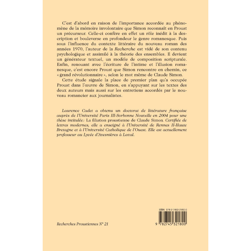 C`est d`abord en raison de l`importance accordée au phénomène de la mémoire involontaire que Simon reconnaît en Proust un précurseur. Celle-ci confère en effet un rôle inédit à la description et bouleverse en profondeur le genre romanesque. Puis sous l`influence du contexte littéraire du nouveau roman des années 1970, l`auteur de la Recherche est vidé de son contenu psychologique et assimilé à la théorie des ensembles. Il devient un générateur textuel, un modèle de composition scripturale. Enfin, renouant avec l`écriture de l`intime et l`illusion romanesque, c`est encore Proust que Simon rencontre en chemin, ce " grand révolutionnaire ", selon le mot même de Claude Simon. Cette étude signale la place de premier plan qu`a occupée Proust dans l`œuvre de Simon, en s`appuyant sur les textes des deux auteurs mais aussi sur les entretiens accordés par le nouveau romancier aux journalistes. Laurence Cadet a obtenu un doctorat de littérature française auprès de l`Université Paris III-Sorbonne Nouvelle en 2004 pour une thèse intitulée : La filiation proustienne de Claude Simon. Certifiée de lettres modernes, elle a enseigné à l`Université de Rennes II-Haute Bretagne et à l`Université Catholique de l`Ouest. Elle est actuellement professeur au Lycée d`Avesnières à Laval.