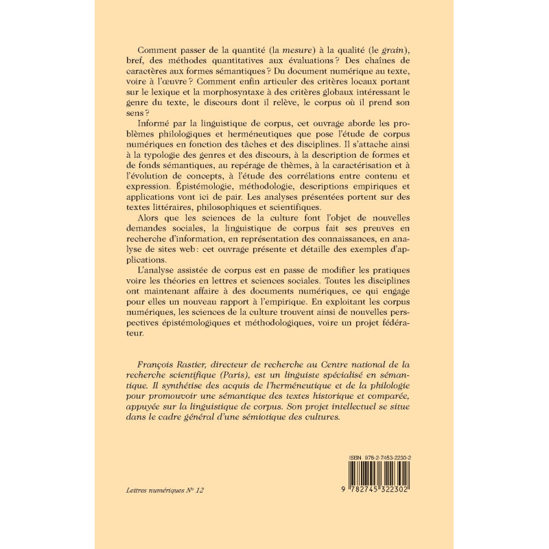 Comment passer de la quantité (la mesure) à la qualité (le grain), bref, des méthodes quantitatives aux évaluations ? Informé par la linguistique de corpus, cet ouvrage aborde les problèmes philologiques et herméneutiques que pose l’étude des corpus numériques. Il s’attache ainsi à la typologie des genres et des discours, à la description de formes et de fonds sémantiques, au repérage de thèmes, à la caractérisation et à l’évolution de concepts, à l’étude des corrélations entre contenu et expression. Épistémologie, méthodologie, descriptions empiriques et applications vont ici de pair. Les analyses présentées décrivent des textes littéraires, philosophiques et scientifiques.