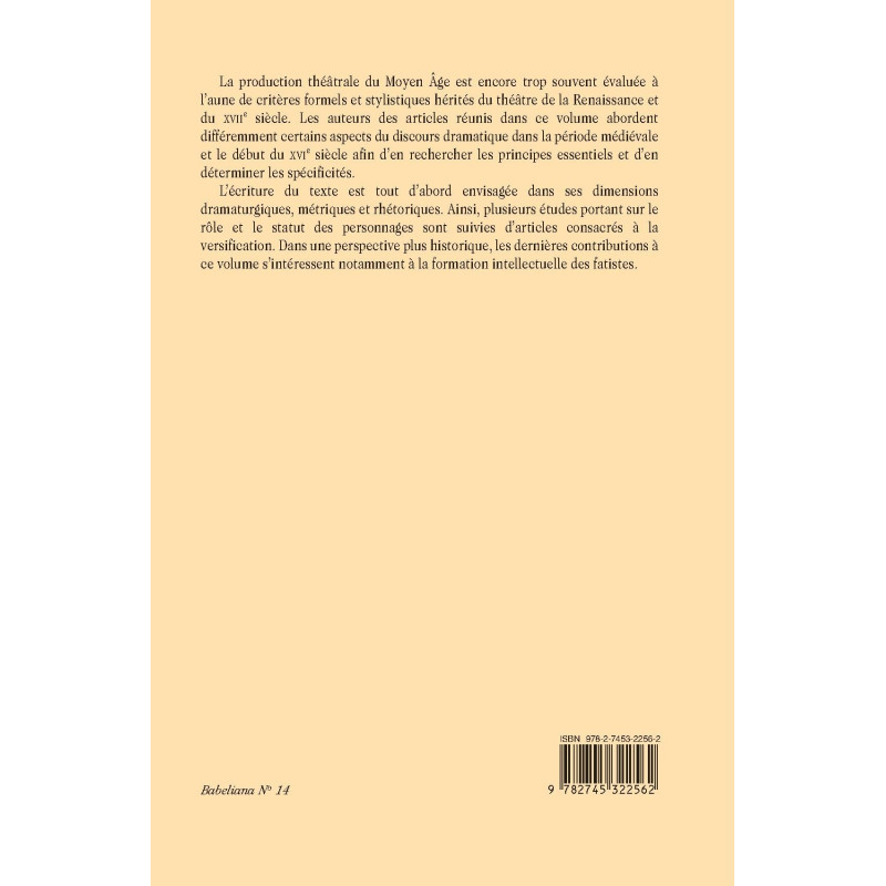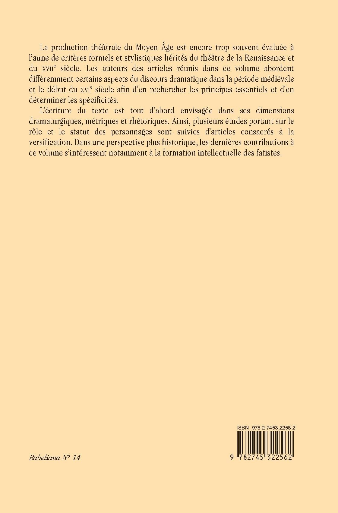 La production théâtrale du Moyen Âge est encore trop souvent évaluée à l`aune de critères formels et stylistiques hérités du théâtre de la Renaissance et du XVIIe siècle. Les auteurs des articles réu nis dans ce volume abordent différemment certains aspects du discours dramatique dans la période médiévale et le début du XVIe siècle afin d`en rechercher les principes essentiels et d`en détermine r les spécificités. L`écriture du texte est tout d`abord envisagée dans ses dimensions dramaturgiques, métriques et rhétoriques. Ainsi, plusieurs études portant sur le rôle et le statut des person nag es sont suivies d`articles consacrés à la versification. Dans une perspective plus historique, les dernières contributions à ce volume s`intéressent notamment à la formation intellectuelle des fatis tes.