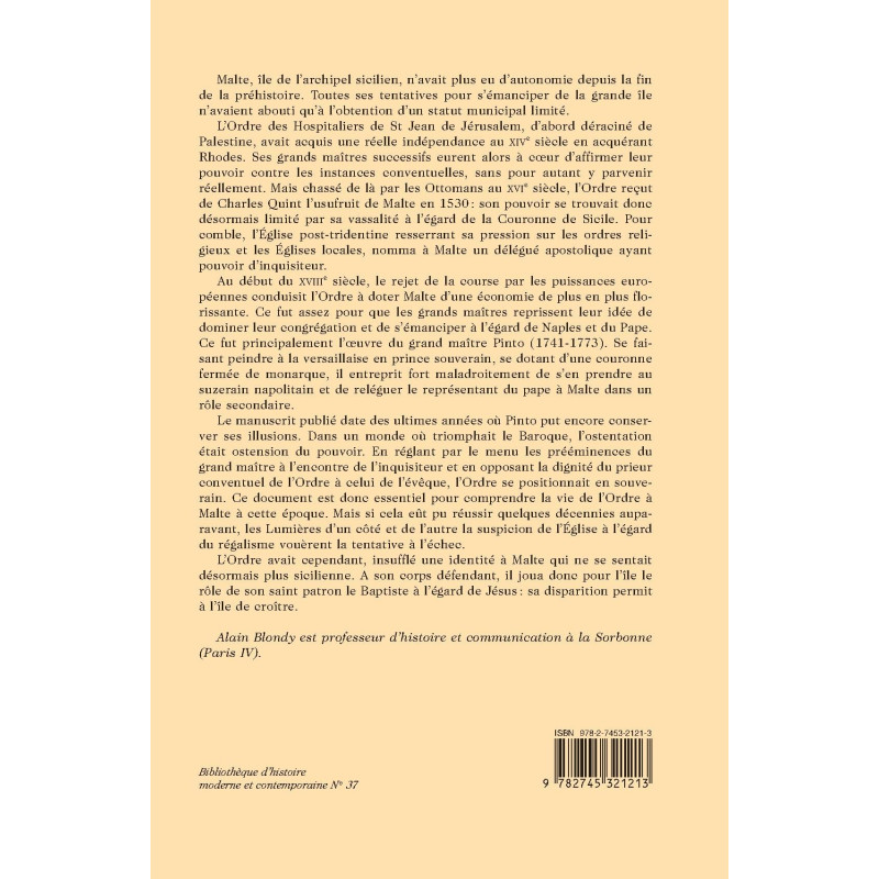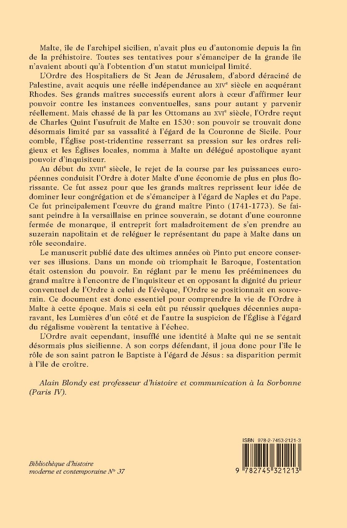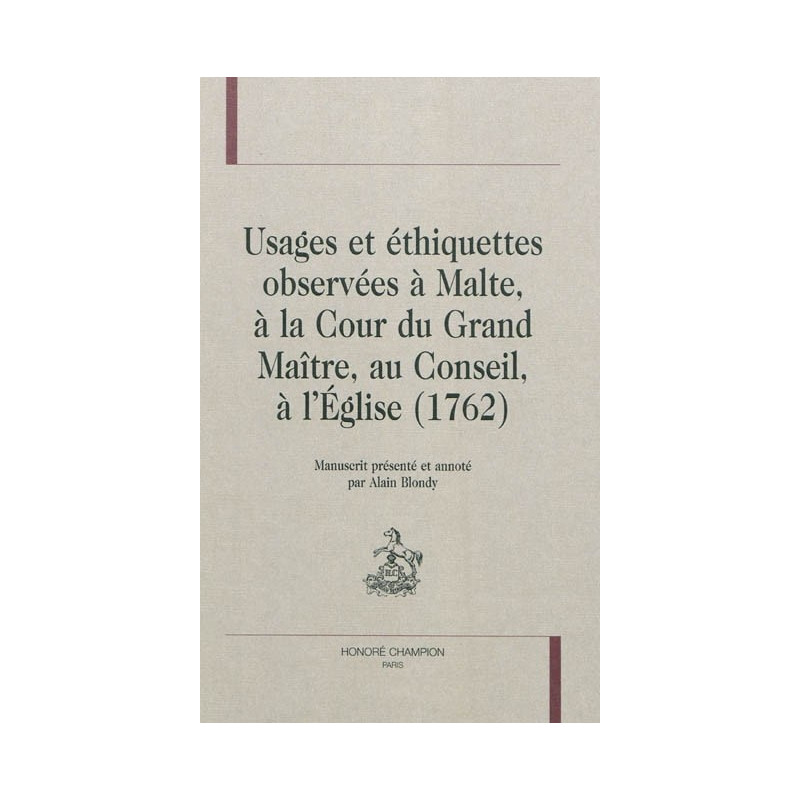 Le manuscrit Usages et éthiquettes observées à Malte, à la Cour du Grand Maître, au Conseil, à l’Église, daté de1762 et conservé à la Bibliothèque nationale de Malte, est un document inédit d’une grande importance qui montre la volonté des grands maîtres du XVIIIe siècle de se démarquer à la fois de leur vassalité à l’égard du roi de Naples et de leur sujétion à l’égard de Rome, incarnée par l’inquisiteur. Rédigé en français, ce mémoire n’est nullement anodin. Dans un monde où la Contre-Réforme et l’absolutisme étaient parvenus avec retard, la codification des usages de cour apparut comme un des moyens de soutenir les prétentions des grands maîtres à la souveraineté. Malheureusement pour Emmanuel Pinto, le fastueux grand maître régnant alors, il fut le dernier acte de ce rêve de grandeur que les cours des Lumières brisèrent sans ménagement.