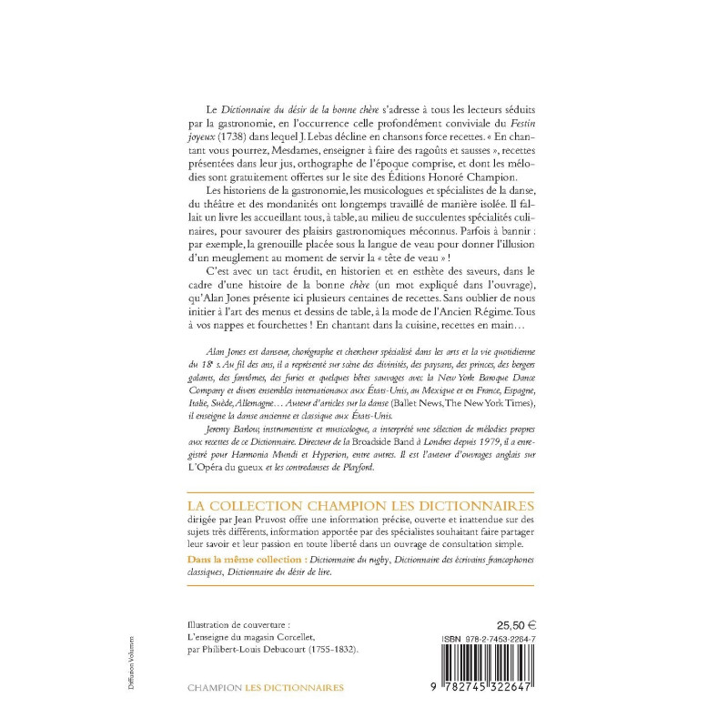 Le Dictionnaire du désir de la bonne chère s’adresse à tous les lecteurs séduits par la gastronomie, en l’occurrence celle profondément conviviale du Festin joyeux (1738) dans lequel J. Lebas décline en chansons force recettes. « En chantant vous pourrez, Mesdames, enseigner à faire des ragoûts et sausses », recettes présentées dans leur jus, orthographe de l’époque comprise, et dont les mélodies sont gratuitement offertes sur le site Honoré Champion.