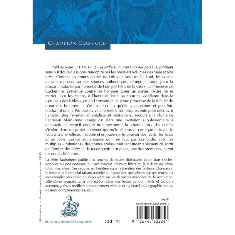 Publiés entre 1710 et 1712, Les Mille et un jours, contes persans, profitent sans nul doute du succès rencontré par les premiers volumes des Mille et une nuits. Comme les contes arabes traduits par Antoine Galland, les contes persans reposent sur des sources authentiques, d`origine turque pour la plupart, traduites par l`orientaliste François Pétis de la Croix. La Princesse de Cachemire, prévenue contre les hommes après un songe, refuse de se marier. Tous les matins, à l`heure du bain, sa nourrice, confiante dans le " pouvoir des fables ", entend convaincre la jeune princesse de la fidélité du cœur des hommes. Il n`est pas certain qu`elle y parvienne et peut-être faudra-t-il que la Princesse vive elle-même son propre conte pour découvrir l`amour. Que l`éminent orientaliste ait peut-être eu recours à la plume de l`écrivain Alain-René Lesage est alors une invitation supplémentaire à découvrir ce recueil encore trop méconnu : la " traduction " des contes s`insère dans un projet cohérent qui mêle sérieux et comique et invite le lecteur à une réflexion subtile et enjouée sur le pouvoir des récits. Les Mille et un jours, contes authentiques qu`il ne faut pas confondre avec les multiples " imitations " des contes arabes, méritent indéniablement de sortir de l`ombre des Nuits et de reconquérir leur place, une des premières, parmi les contes littéraires.