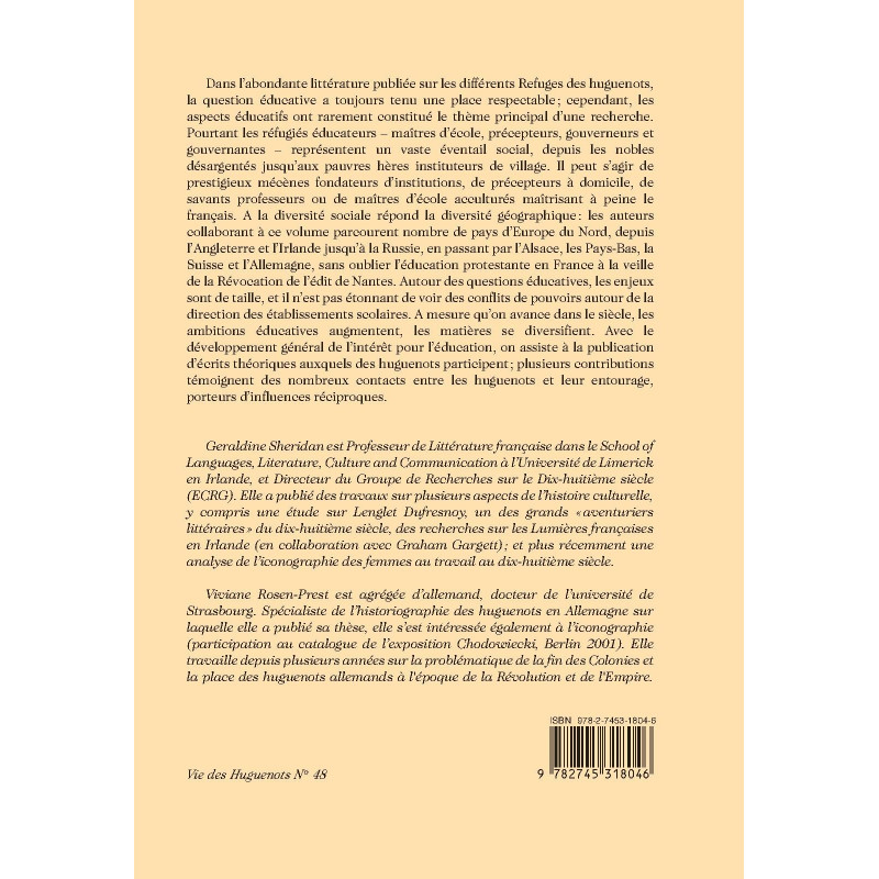 Dans l`abondante littérature publiée sur les différents Refuges des huguenots, la question éducative a toujours tenu une place respectable ; cependant, les aspects éducatifs ont rarement constitué le thème principal d`une recherche. Pourtant les réfugiés éducateurs - maîtres d`école, précepteurs, gouverneurs et gouvernantes - représentent un vaste éventail social, depuis les nobles désargentés jusqu`aux pauvres hères instituteurs de village. Il peut s`agir de prestigieux mécènes fondateurs d`institutions, de précepteurs à domicile, de savants professeurs ou de maîtres d`école acculturés maîtrisant à peine le français. A la diversité sociale répond la diversité géographique : les auteurs collaborant à ce volume parcourent nombre de pays d`Europe du Nord, depuis l`Angleterre et l`Irlande jusqu`à la Russie, en passant par l`Alsace, les Pays-Bas, la Suisse et l`Allemagne, sans oublier l`éducation protestante en France à la veille de la Révocation de l`édit de Nantes. Autour des questions éducatives, les enjeux sont de taille, et il n`est pas étonnant de voir des conflits de pouvoirs autour de la direction des établissements scolaires. A mesure qu`on avance dans le siècle, les ambitions éducatives augmentent, les matières se diversifient. Avec le développement général de l`intérêt pour l`éducation, on assiste à la publication d`écrits théoriques auxquels des huguenots participent ; plusieurs contributions témoignent des nombreux contacts entre les huguenots et leur entourage, porteurs d`influences réciproques.