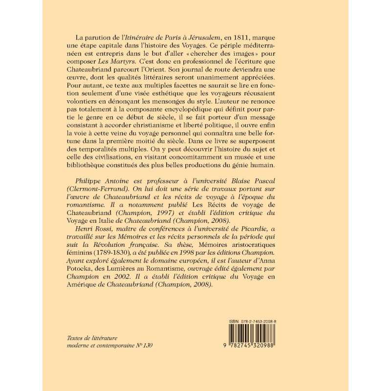 La parution de l`Itinéraire de Paris à Jérusalem, en 1811, marque une étape capitale dans l`histoire des Voyages. Ce périple méditerranéen est entrepris dans le but d`aller " chercher des images " pour composer Les Martyrs. C`est donc en professionnel de l`écriture que Chateaubriand parcourt l`Orient. Son journal de route deviendra une œuvre, dont les qualités littéraires seront unanimement appréciées. Pour autant, ce texte aux multiples facettes ne saurait se lire en fonction seulement d`une visée esthétique que les voyageurs récusaient volontiers en dénonçant les mensonges du style. L`auteur ne renonce pas totalement à la composante encyclopédique qui définit pour partie le genre en ce début de siècle, il se fait porteur d`un message consistant à accorder christianisme et liberté politique, il ouvre enfin la voie à cette veine du voyage personnel qui connaîtra une belle fortune dans la première moitié du siècle. Dans ce livre se superposent des temporalités multiples. On y peut découvrir l`histoire du sujet et celle des civilisations, en visitant concomitamment un musée et une bibliothèque constitués des plus belles productions du génie humain.