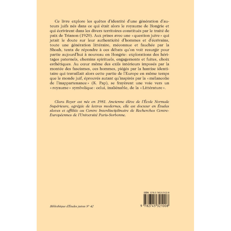 Ce livre explore les quêtes d`identité d`une génération d`auteurs juifs nés dans ce qui était alors le royaume de Hongrie et qui écrivirent dans les divers territoires constitués par le traité de paix de Trianon (1920). Aux prises avec une "question juive " qui jetait le doute sur leur authenticité d`hommes et d`écrivains, toute une génération littéraire, méconnue et fauchée par la Shoah, tenta de répondre à ces débats qu`on voit resurgir pour partie aujourd`hui à nouveau en Hongrie : explorations des héritages paternels, chemins spirituels, engagements et fuites, choix esthétiques. Au cœur même des exils intérieurs imposés par la montée des fascismes, ces hommes, piégés par la hantise identitaire qui travaillait alors cette partie de l`Europe en même temps que le monde juif, éprouvés autant qu`inspirés par la "mélancolie de l`inappartenance " (K. Pap), se frayèrent une voie vers un " royaume" symbolique : celui, inaliénable, de la "Littérature ". Clara Royer est née en 1981. Ancienne élève de l`École Normale Supérieure, agrégée de lettres modernes, elle est docteur en Études slaves et affiliée au Centre Interdisciplinaire de Recherches Centre- Européennes de l`Université Paris-Sorbonne.