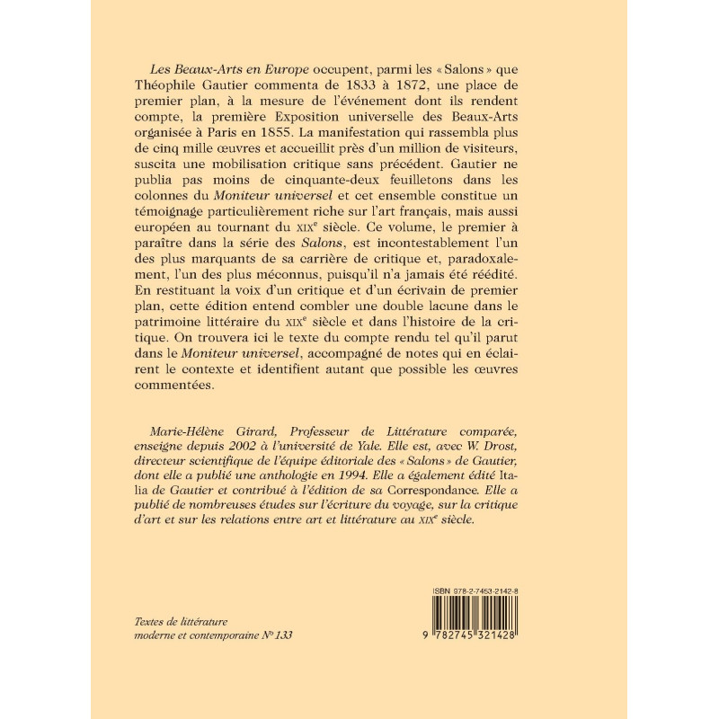 Les Beaux-Arts en Europe occupent, parmi les " Salons " que Théophile Gautier commenta de 1833 à 1872, une place de premier plan, à la mesure de l`événement dont ils rendent compte, la première Exposition universelle des Beaux-Arts organisée à Paris en 1855. La manifestation qui rassembla plus de cinq mille œuvres et accueillit près d`un million de visiteurs, suscita une mobilisation critique sans précédent. Gautier ne publia pas moins de cinquante-deux feuilletons dans les colonnes du Moniteur universel et cet ensemble constitue un témoignage particulièrement riche sur l`art français, mais aussi européen au tournant du XIXe siècle. Ce volume, le premier à paraître dans la série des Salons, est incontestablement l`un des plus marquants de sa carrière de critique et, paradoxalement, l`un des plus méconnus, puisqu`il n`a jamais été réédité. En restituant la voix d`un critique et d`un écrivain de premier plan, cette édition entend combler une double lacune dans le patrimoine littéraire du XIXe siècle et dans l`histoire de la critique. On trouvera ici le texte du compte rendu tel qu`il parut dans le Moniteur universel, accompagné de notes qui en éclairent le contexte et identifient autant que possible les œuvres commentées.