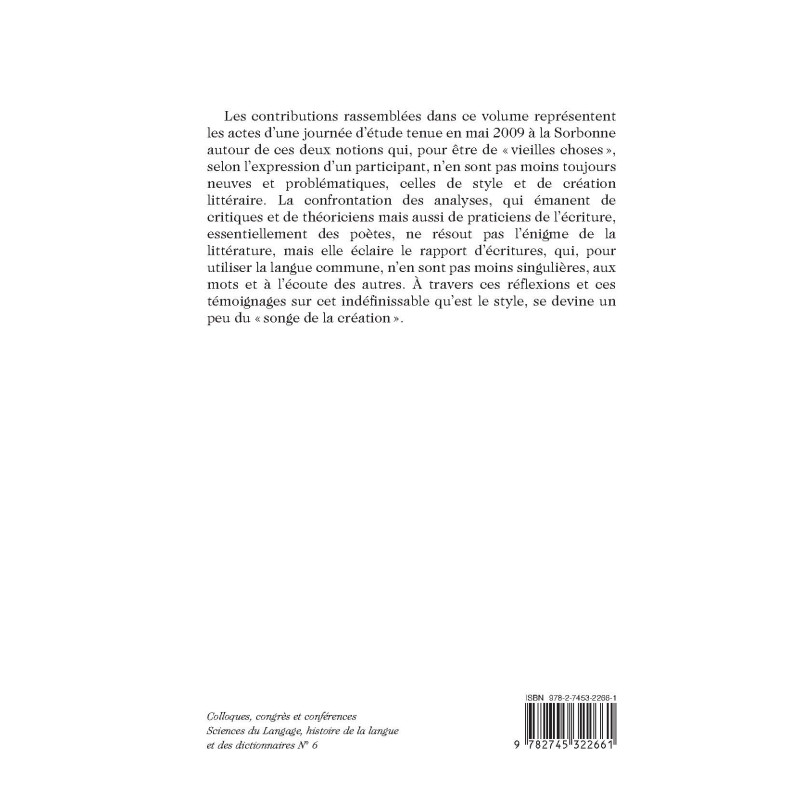 Les contributions rassemblées dans ce volume représentent les actes d`une journée d`étude tenue en mai 2009 à la Sorbonne autour de ces deux notions qui, pour être de " vieilles choses ", selon l`expression d`un participant, n`en sont pas moins toujours neuves et problématiques, celles de style et de création littéraire. La confrontation des analyses, qui émanent de critiques et de théoriciens mais aussi de praticiens de l`écriture, essentiellement des poètes, ne résout pas l`énigme de la littérature, mais elle éclaire le rapport d`écritures, qui, pour utiliser la langue commune, n`en sont pas moins singulières, aux mots et à l`écoute des autres. À travers ces réflexions et ces témoignages sur cet indéfinissable qu`est le style, se devine un peu du " songe de la création ".