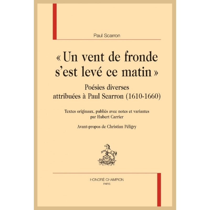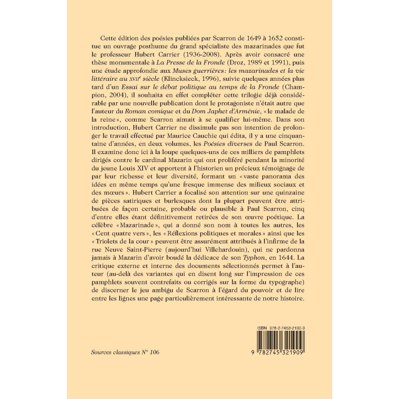 Cette édition des poésies publiées par Scarron de 1649 à 1652 constitue un ouvrage posthume du grand spécialiste des mazarinades que fut le professeur Hubert Carrier (1936-2008). Après avoir consacré une thèse monumentale à La Presse de la Fronde (Droz, 1989 et 1991), puis une étude approfondie aux Muses guerrières : les mazarinades et la vie littéraire au XVIIe siècle (Klincksieck, 1996), suivie quelques années plus tard d`un Essai sur le débat politique au temps de la Fronde (Champion, 2004), il souhaita en effet compléter cette trilogie déjà considérable par une nouvelle publication dont le protagoniste n`était autre que l`auteur du Roman comique et du Dom Japhet d`Arménie, " le malade de la reine ", comme Scarron aimait à se qualifier lui-même. Dans son introduction, Hubert Carrier ne dissimule pas son intention de prolonger le travail effectué par Maurice Cauchie qui édita, il y a une cinquantaine d`années, en deux volumes, les Poésies diverses de Paul Scarron. Il examine donc ici à la loupe quelques-uns de ces milliers de pamphlets dirigés contre le cardinal Mazarin qui ont proliféré pendant la minorité du jeune Louis XIV et apportent à l`historien un précieux témoignage de par leur richesse et leur diversité, formant un " vaste panorama des idées en même temps qu`une fresque immense des milieux sociaux et des mœurs ". Hubert Carrier a focalisé son attention sur une quinzaine de pièces satiriques et burlesques dont la plupart peuvent être attribuées de façon certaine, probable ou plausible à Paul Scarron, cinq d`entre elles étant définitivement retirées de son œuvre poétique. La célèbre "Mazarinade ", qui a donné son nom à toutes les autres, les "Cent quatre vers ", les " Réflexions politiques et morales " ainsi que les "Triolets de la cour " peuvent être assurément attribués à l`infirme de la rue Neuve Saint-Pierre (aujourd`hui Villehardouin), qui ne pardonna jamais à Mazarin d`avoir boudé la dédicace de son Typhon, en 1644. La critique externe et interne des documents sélectionnés permet à l`auteur (au-d