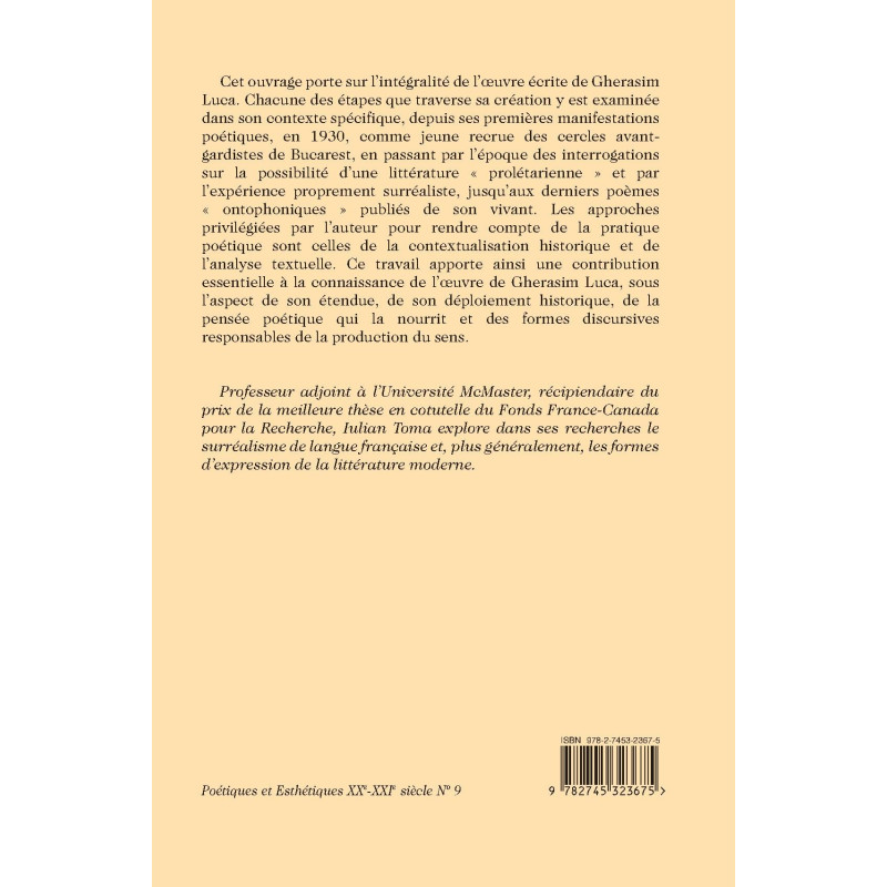 Cet ouvrage porte sur l`intégralité de l`œuvre écrite de Gherasim Luca. Chacune des étapes que traverse sa création y est examinée dans son contexte spécifique, depuis ses premières manifestations poétiques, en 1930, comme jeune recrue des cercles avantgardistes de Bucarest, en passant par l`époque des interrogations sur la possibilité d`une littérature " prolétarienne " et par l`expérience proprement surréaliste, jusqu`aux derniers poèmes " ontophoniques " publiés de son vivant. Les approches privilégiées par l`auteur pour rendre compte de la pratique poétique sont celles de la contextualisation historique et de l`analyse textuelle. Ce travail apporte ainsi une contribution essentielle à la connaissance de l`œuvre de Gherasim Luca, sous l`aspect de son étendue, de son déploiement historique, de la pensée poétique qui la nourrit et des formes discursives responsables de la production du sens. Le livre contient des fragments des écrits inédits de Gherasim Luca ainsi que des traductions en français d’extraits significatifs de l’œuvre roumaine.