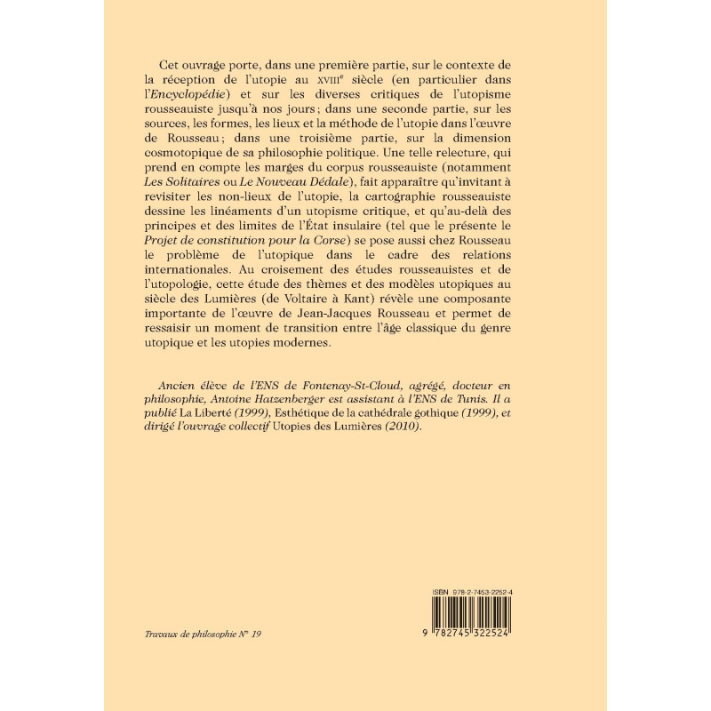 Cet ouvrage porte, dans une première partie, sur le contexte de la réception de l`utopie au XVIIIe siècle (en particulier dans l`Encyclopédie) et sur les diverses critiques de l`utopisme rousseauiste jusqu`à nos jours ; dans une seconde partie, sur les sources, les formes, les lieux et la méthode de l`utopie dans l`œuvre de Rousseau ; dans une troisième partie, sur la dimension cosmotopique de sa philosophie politique. Une telle relecture, qui prend en compte les marges du corpus rousseauiste (notamment Les Solitaires ou Le Nouveau Dédale), fait apparaître qu`invitant à revisiter les non-lieux de l`utopie, la cartographie rousseauiste dessine les linéaments d`un utopisme critique, et qu`au-delà des principes et des limites de l`État insulaire (tel que le présente le Projet de constitution pour la Corse) se pose aussi chez Rousseau le problème de l`utopique dans le cadre des relations internationales. Au croisement des études rousseauistes et de l`utopologie, cette étude des thèmes et des modèles utopiques au siècle des Lumières (de Voltaire à Kant) révèle une composante importante de l`œuvre de Jean-Jacques Rousseau et permet de ressaisir un moment de transition entre l`âge classique du genre utopique et les utopies modernes. Ancien élève de l`ENS de Fontenay-St-Cloud, agrégé, docteur en philosophie, Antoine Hatzenberger est assistant à l`ENS de Tunis. Il a publié La Liberté (1999), Esthétique de la cathédrale gothique (1999), et dirigé l`ouvrage collectif Utopies des Lumières (2010).