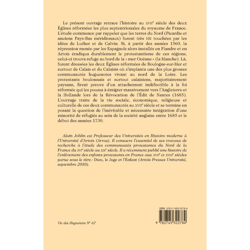 Le présent ouvrage retrace l`histoire au XVIIe siècle des deux Églises réformées les plus septentrionales du royaume de France. L`étude commence par rappeler que les terres du Nord (Picardie et anciens Pays-Bas méridionaux) furent très tôt touchées par les idées de Luther et de Calvin. Si, à partir des années 1560, la répression menée par les Espagnols alors installés en Flandre et en Artois éradiqua durablement le protestantisme de ces régions, celui-ci trouva refuge au bord de la "mer Océane " (la Manche). Là , furent dressées les deux Églises réformées de Boulogne-sur-Mer et surtout de Calais et du Calaisis où s`implanta une des plus grosses communautés huguenotes vivant au nord de la Loire. Les protestants boulonnais et surtout calaisiens, majoritairement paysans, firent preuve d`un attachement indéfectible à la foi réformée qui les poussa à émigrer massivement vers l`Angleterre et la Hollande lors de la Révocation de l`Édit de Nantes (1685). L`ouvrage traite de la vie sociale, économique, religieuse et culturelle de ces deux communautés au XVIIe siècle et se termine en posant la question de l`inévitable et nécessaire intégration d`une minorité de réfugiés au sein de la société anglaise entre 1685 et le début des années 1730.