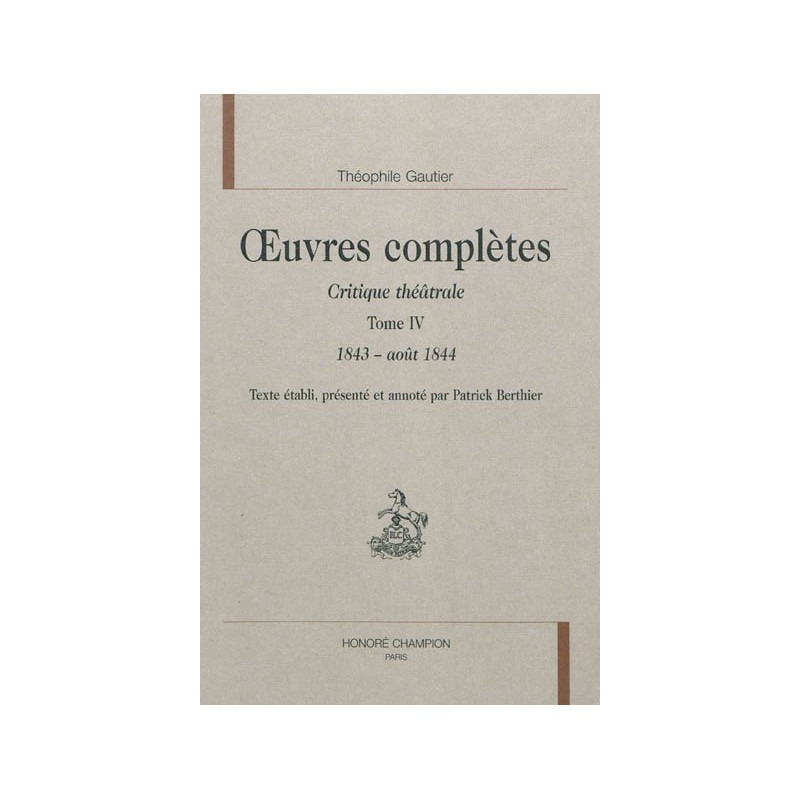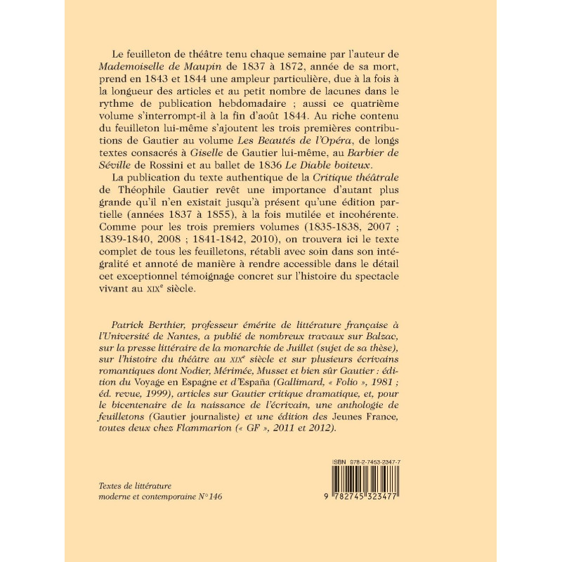 Le feuilleton de théâtre tenu chaque semaine par l’auteur de Mademoiselle de Maupin de 1837 à 1872, année de sa mort, prend en 1843 et 1844 une ampleur particulière, due à la fois à la longueur des articles et au petit nombre de lacunes dans le rythme de publication hebdomadaire ; aussi ce quatrième volume s’interrompt-il à la fin d’août 1844. Au riche contenu du feuilleton lui-même s’ajoutent les trois premières contributions de Gautier au volume Les Beautés de l’Opéra, de longs textes consacrés à Giselle de Gautier lui-même, au Barbier de Séville de Rossini et au ballet de 1836 Le Diable boiteux. La publication du texte authentique de la Critique théâtrale de Théophile Gautier revêt une importance d’autant plus grande qu’il n’en existait jusqu’à présent qu’une édition partielle (années 1837 à 1855), à la fois mutilée et incohérente. Comme pour les trois premiers volumes (1835-1838, 2007 ; 1839-1840, 2008 ; 1841-1842, 2010), on trouvera ici le texte complet de tous les feuilletons, rétabli avec soin dans son intégralité et annoté de manière à rendre accessible dans le détail cet exceptionnel témoignage concret sur l’histoire du spectacle vivant au XIXe siècle. Patrick Berthier, professeur émérite de littérature française à l’Université de Nantes, a publié de nombreux travaux sur Balzac, sur la presse littéraire de la monarchie de Juillet (sujet de sa thèse), sur l’histoire du théâtre au XIXe siècle et sur plusieurs écrivains romantiques dont Nodier, Mérimée, Musset et bien sûr Gautier : édition du Voyage en Espagne et d’España (Gallimard, « Folio », 1981 ; éd. revue, 1999), articles sur Gautier critique dramatique, et, pour le bicentenaire de la naissance de l’écrivain, une anthologie de feuilletons (Gautier journaliste) et une édition des Jeunes France, toutes deux chez Flammarion (« GF », 2011 et 2012).