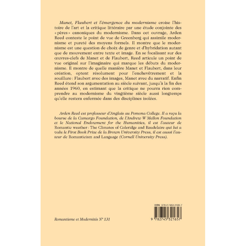 Manet, Flaubert et l’émergence du modernisme croise l’histoire de l’art et la critique littéraire par une étude conjointe des «pères » canoniques du modernisme. Dans cet ouvrage, Arden Reed conteste le point de vue de Greenberg qui assimile modernisme et pureté des moyens formels. Il montre que le modernisme est une question de choix de genre et d’hybridation autant que de mouvement entre texte et image. En se focalisant sur des œuvres-clefs de Manet et de Flaubert, Reed articule un point de vue original sur l’imaginaire qui marque les débuts du modernisme. Il montre de quelle manière Manet et Flaubert, dans leur création, optent résolument pour l’enchevêtrement et la souillure : Flaubert avec des images, Manet avec du narratif. Enfin Reed étend son argumentation au siècle suivant, jusqu’à la fin des années 1960, en estimant que la critique ne pourra rien comprendre au modernisme du vingtième siècle aussi longtemps qu’elle restera enfermée dans des disciplines isolées. Arden Reed est professeur d’Anglais au Pomona College. Il a reçu la bourse de la Camargo Foundation, de l’Andrew W Mellon Foundation et le National Endowment for the Humanities, il est l’auteur de Romantic weather : The Climates of Coleridge and Baudelaire qui lui a valu le First Book Prize de la Brown University Press, il est aussi l’auteur de Romanticism and Language (Cornell University Press).