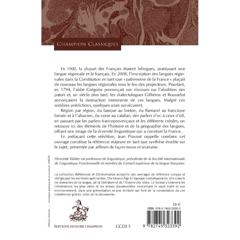 En 1900, la plupart des Français étaient bilingues, pratiquant une langue régionale et le français. En 2008, l’inscription des langues régionales dans la Constitution en tant que « patrimoine de la France » plaçait de nouveau les langues régionales sous le feu des projecteurs. Pourtant, en 1794, l’abbé Grégoire prononçait son discours sur l’abolition des patois et, un siècle plus tard, les dialectologues Gilliéron et Rousselot annonçaient la destruction imminente de ces langues. Malgré ces sombres prédictions, quelques-unes survécurent. Région par région, du basque au breton, du flamand au francique lorrain et à l’alsacien, du corse au catalan, des parlers d’oc à ceux d’oïl, en passant par les parlers franco-provençaux et les différents créoles, on retrouve ici des éléments de l’histoire et de la géographie des langues, offrant une image de la diversité linguistique qui a construit la France. En préfaçant cette réédition, Jean Pruvost rappelle combien cet ouvrage constitue la référence majeure en tant que synthèse érudite sur le sujet, présentée par ailleurs de façon neuve et souriante. Henriette Walter est professeur de linguistique, présidente de la Société Internationale de Linguistique Fonctionnelle et membre du Conseil supérieur de la langue française.
