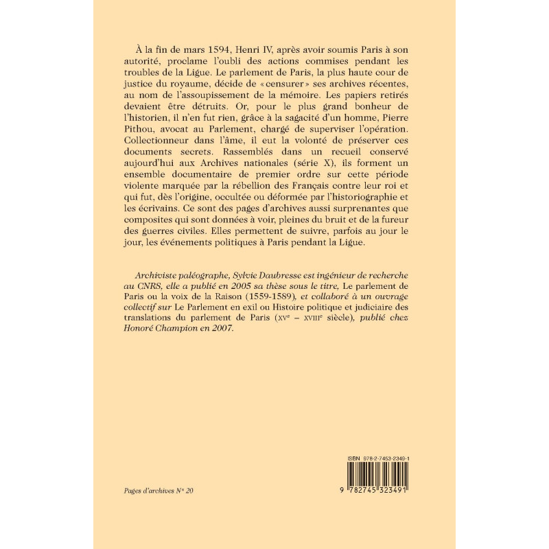 À la fin de mars 1594, Henri IV, après avoir soumis Paris à son autorité, proclame l’oubli des actions commises pendant les troubles de la Ligue. Le parlement de Paris, la plus haute cour de justice du royaume, décide de « censurer » ses archives récentes, au nom de l’assoupissement de la mémoire. Les papiers retirés devaient être détruits. Or, pour le plus grand bonheur de l’historien, il n’en fut rien, grâce à la sagacité d’un homme, Pierre Pithou, avocat au Parlement, chargé de superviser l’opération. Collectionneur dans l’âme, il eut la volonté de préserver ces documents secrets. Rassemblés dans un recueil conservé aujourd’hui aux Archives nationales (série X), ils forment un ensemble documentaire de premier ordre sur cette période violente marquée par la rébellion des Français contre leur roi et qui fut, dès l’origine, occultée ou déformée par l’historiographie et les écrivains. Ce sont des pages d’archives aussi surprenantes que composites qui sont données à voir, pleines du bruit et de la fureur des guerres civiles. Elles permettent de suivre, parfois au jour le jour, les événements politiques à Paris pendant la Ligue. Archiviste paléographe, Sylvie Daubresse est ingénieur de recherche au CNRS, elle a publié en 2005 sa thèse sous le titre, Le parlement de Paris ou la voix de la Raison (1559-1589), et collaboré à un ouvrage collectif sur Le Parlement en exil ou Histoire politique et judiciaire des translations du parlement de Paris (XVe – XVIIIe siècle), publié chez Honoré Champion en 2007.