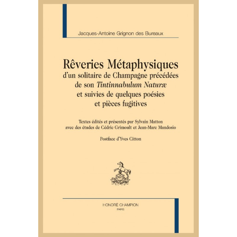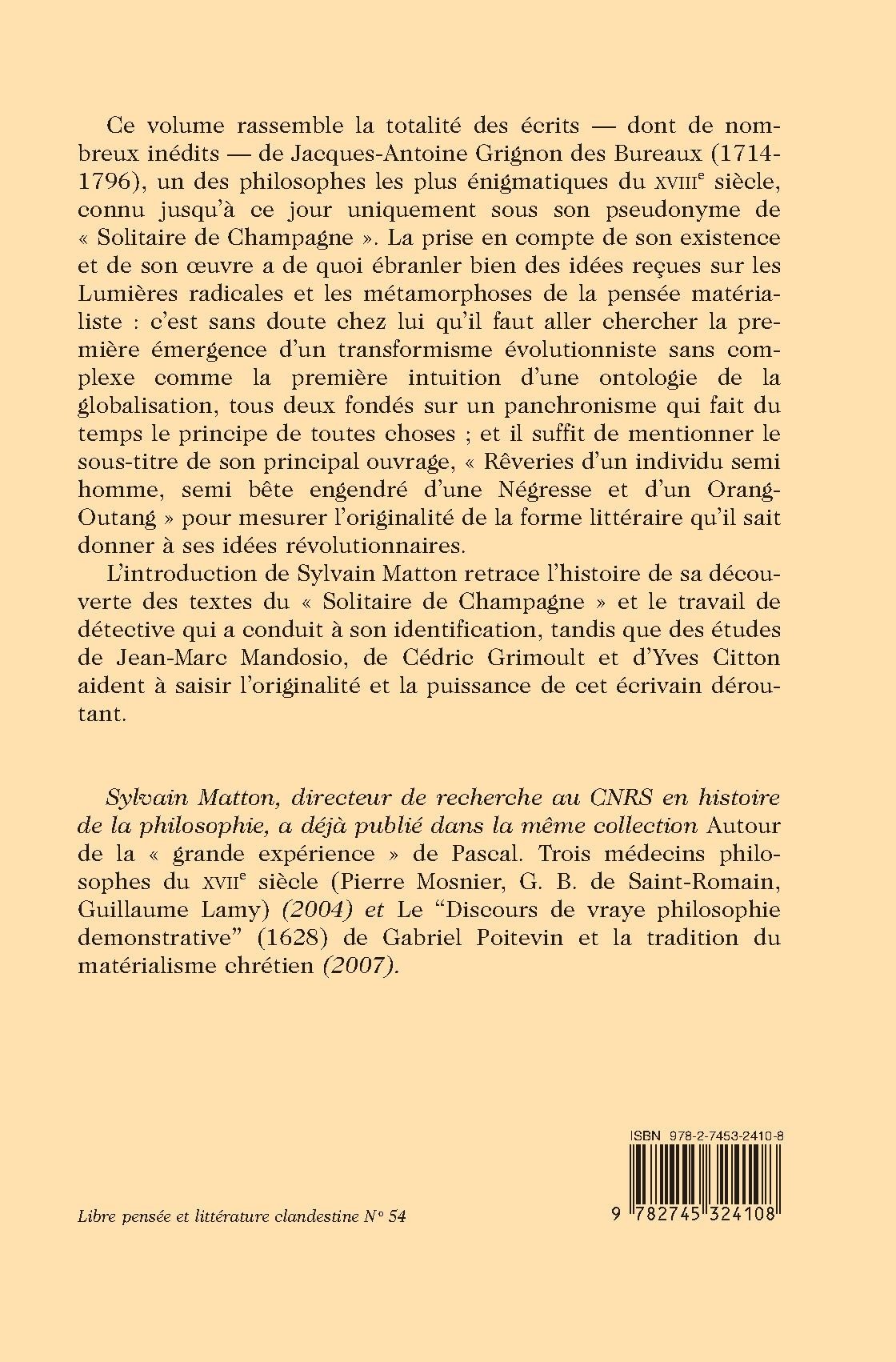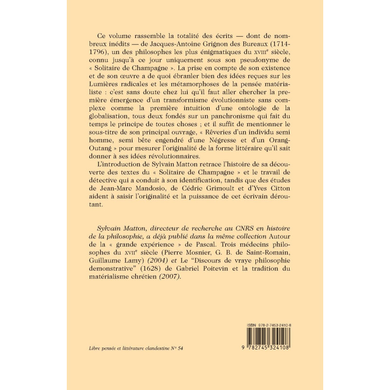 Ce volume rassemble la totalité des écrits — dont de nombreux inédits — de Jacques-Antoine Grignon des Bureaux (1714- 1796), un des philosophes les plus énigmatiques du XVIIIe siècle, connu jusqu’à ce jour uniquement sous son pseudonyme de « Solitaire de Champagne ». La prise en compte de son existence et de son œuvre a de quoi ébranler bien des idées reçues sur les Lumières radicales et les métamorphoses de la pensée matérialiste : c’est sans doute chez lui qu’il faut aller chercher la première émergence d’un transformisme évolutionniste sans complexe comme la première intuition d’une ontologie de la globalisation, tous deux fondés sur un panchronisme qui fait du temps le principe de toutes choses ; et il suffit de mentionner le sous-titre de son principal ouvrage, « Rêveries d’un individu semi homme, semi bête engendré d’une Négresse et d’un Orang- Outang » pour mesurer l’originalité de la forme littéraire qu’il sait donner à ses idées révolutionnaires. L’introduction de Sylvain Matton retrace l’histoire de sa découverte des textes du « Solitaire de Champagne » et le travail de détective qui a conduit à son identification, tandis que des études de Jean-Marc Mandosio, de Cédric Grimoult et d’Yves Citton aident à saisir l’originalité et la puissance de cet écrivain déroutant.