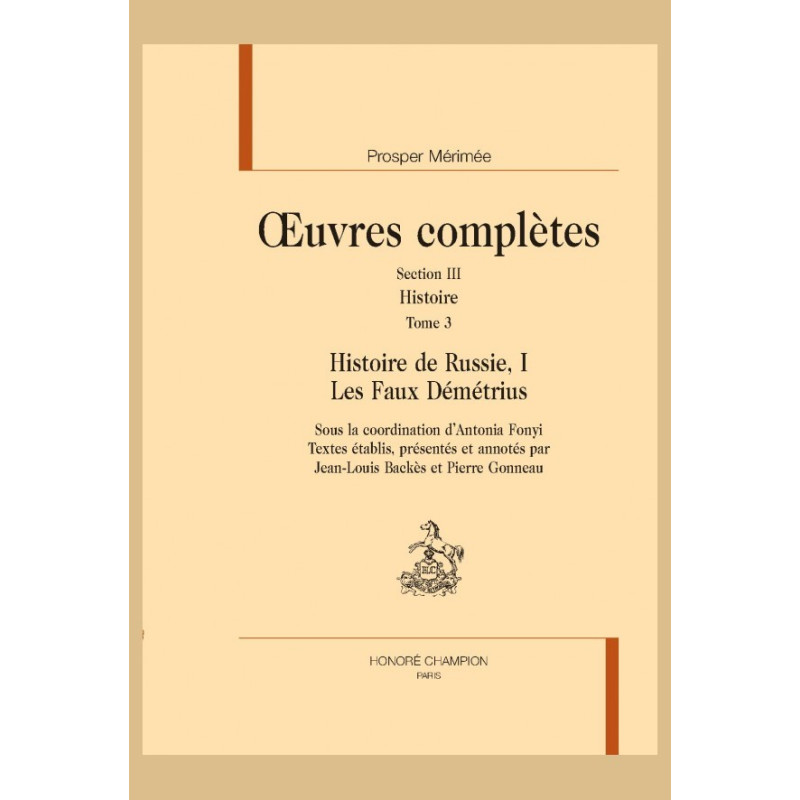 Traducteur et critique de Pouchkine, de Gogol, de Tourgueniev, Mérimée nous a aussi laissé d’importantes études sur l’histoire russe. Dans Épisode de l’histoire de Russie. Les Faux Démétrius, il campe la figure d’un imposteur qui avait l’étoffe d’un grand roi. Ses projets réformateurs, inacceptables pour la noblesse traditionaliste, lui coûtèrent la vie ; Pierre le Grand, le fondateur de la Russie moderne, les réalisera, dans un autre siècle. Élaboration littéraire autour du même héros, Les Débuts d’un aventurier propose une hypothèse pour expliquer les origines énigmatiques du jeune prodige que fut Démétrius. Le volume contient, en outre, deux articles sur l’époque, que Mérimée n’a pas recueillis. Jean-Louis Backès, professeur émérite à l’Université de Paris- Sorbonne, a publié des études sur Pouchkine, sur la poésie romantique en Europe et sur la survie littéraire des mythes antiques. Pierre Gonneau enseigne l’histoire russe à l’Université Paris- Sorbonne et à l’École pratique des Hautes Études. Il s’intéresse notamment à la formation de l’Empire russe et à ses mythes fondateurs.