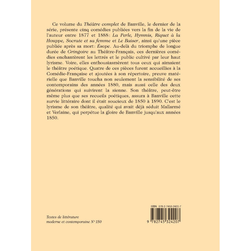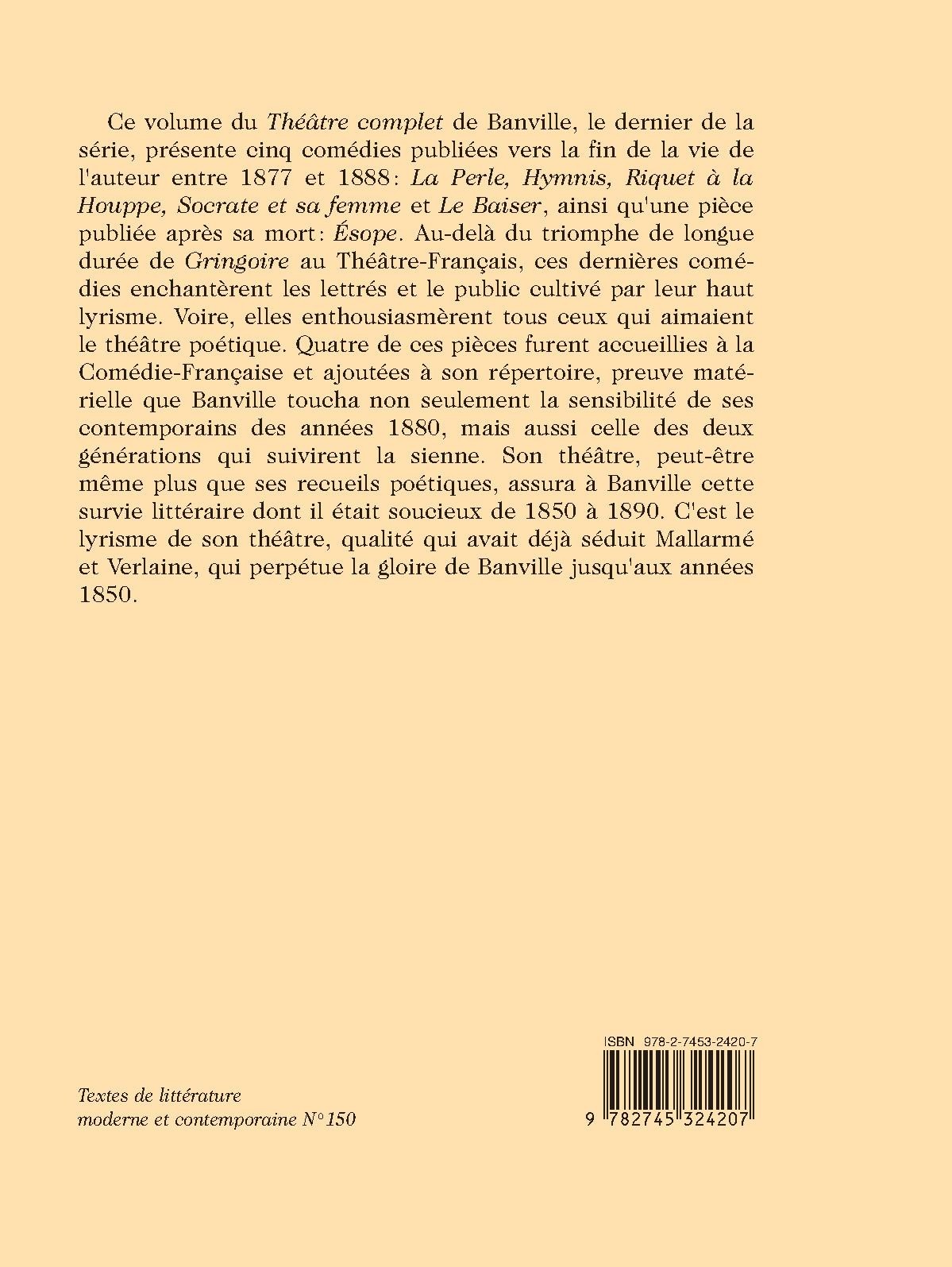 Ce volume du Théâtre complet de Banville, le dernier de la série, présente cinq comédies publiées vers la fin de la vie de l`auteur entre 1877 et 1888: La Perle, Hymnis, Riquet à la Houppe, Socrate et sa femme et Le Baiser, ainsi qu`une pièce publiée après sa mort: Ésope. Au-delà du triomphe de longue durée de Gringoire au Théâtre-Français, ces dernières comédies enchantèrent les lettrés et le public cultivé par leur haut lyrisme. Voire, elles enthousiasmèrent tous ceux qui aimaient le théâtre poétique. Quatre de ces pièces furent accueillies à la Comédie-Française et ajoutées à son répertoire, preuve matérielle que Banville toucha non seulement la sensibilité de ses contemporains des années 1880, mais aussi celle des deux générations qui suivirent la sienne. Son théâtre, peut-être même plus que ses recueils poétiques, assura à Banville cette survie littéraire dont il était soucieux de 1850 à 1890. C`est le lyrisme de son théâtre, qualité qui avait déjà séduit Mallarmé et Verlaine, qui perpétue la gloire de Banville jusqu`aux années 1850.
