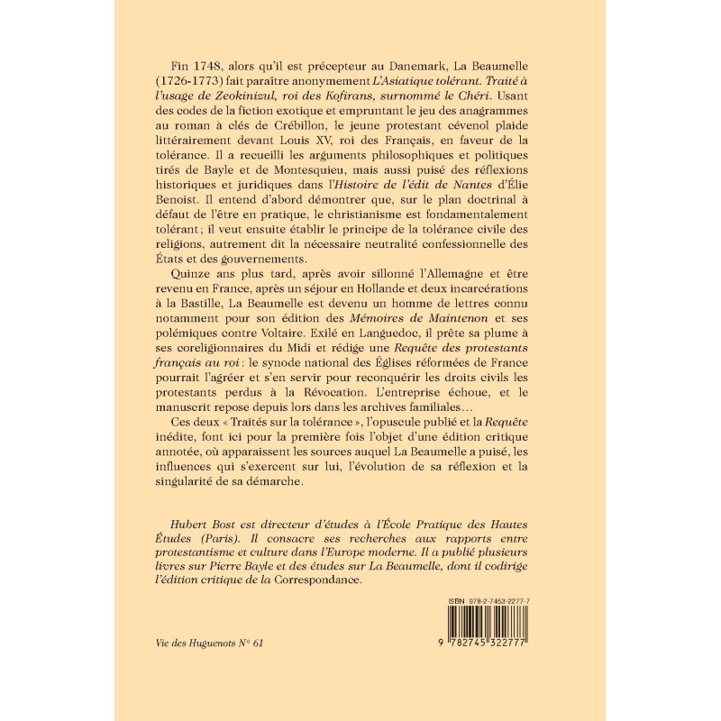Fin 1748, alors qu’il est précepteur au Danemark, La Beaumelle (1726-1773) fait paraître anonymement L’Asiatique tolérant. Traité à l’usage de Zeokinizul, roi des Kofirans, surnommé le Chéri. Usant des codes de la fiction exotique et empruntant le jeu des anagrammes au roman à clés de Crébillon, le jeune protestant cévenol plaide littérairement devant Louis XV, roi des Français, en faveur de la tolérance. Il a recueilli les arguments philosophiques et politiques tirés de Bayle et de Montesquieu, mais aussi puisé des réflexions historiques et juridiques dans l’Histoire de l’édit de Nantes d’Élie Benoist. Il entend d’abord démontrer que, sur le plan doctrinal à défaut de l’être en pratique, le christianisme est fondamentalement tolérant ; il veut ensuite établir le principe de la tolérance civile des religions, autrement dit la nécessaire neutralité confessionnelle des États et des gouvernements. Quinze ans plus tard, après avoir sillonné l’Allemagne et être revenu en France, après un séjour en Hollande et deux incarcérations à la Bastille, La Beaumelle est devenu un homme de lettres connu notamment pour son édition des Mémoires de Maintenon et ses polémiques contre Voltaire. Exilé en Languedoc, il prête sa plume à ses coreligionnaires du Midi et rédige une Requête des protestants français au roi : le synode national des Églises réformées de France pourrait l’agréer et s’en servir pour reconquérir les droits civils les protestants perdus à la Révocation. L’entreprise échoue, et le manuscrit repose depuis lors dans les archives familiales… Ces deux «Traités sur la tolérance », l’opuscule publié et la Requête inédite, font ici pour la première fois l’objet d’une édition critique annotée, où apparaissent les sources auquel La Beaumelle a puisé, les influences qui s’exercent sur lui, l’évolution de sa réflexion et la singularité de sa démarche.