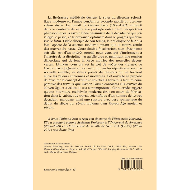 La littérature médiévale devient le sujet du discours scientifique moderne en France pendant la seconde moitié du dix-neuvième siècle. Le travail de Gaston Paris (1839-1903) s’inscrit dans le contexte de cette ère partagée entre deux perspectives philosophiques, à savoir l’idée pessimiste de la décadence qui privilégie le passé, et la croyance optimiste dans le progrès qui favorise le futur. Fidèle disciple de son temps, le philologue se fait à la fois l’apôtre de la science moderne autant que le maître érudit des œuvres du passé. Cette double focalisation, aussi fascinante soit-elle, est d’un intérêt crucial pour ceux qui s’intéressent à l’histoire de la discipline, vu qu’elle crée et maintient une tension dialectique qui devient la force motrice des nouvelles découvertes. L’amour courtois est la clef de voûte des travaux de Gaston Paris joignant en son sein, tout en les répartissant sur une nouvelle échelle, les divers points de tensions qui se forment entre les valeurs anciennes et modernes. Cet ouvrage se propose de revisiter le concept d’amour courtois à travers la lecture comparative des travaux que Gaston Paris a consacrés aux œuvres du Moyen Âge et à celles de ses contemporains. Cette étude suggère qu’une littérature médiévale moderne était en cours de fabrication dans le cabinet de travail scientifique d’un homme de lettres décadent, marquant ainsi une rupture avec l’ère romantique du début du siècle qui rêvait toujours d’un Moyen Âge ancien et révolu.