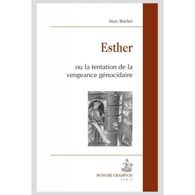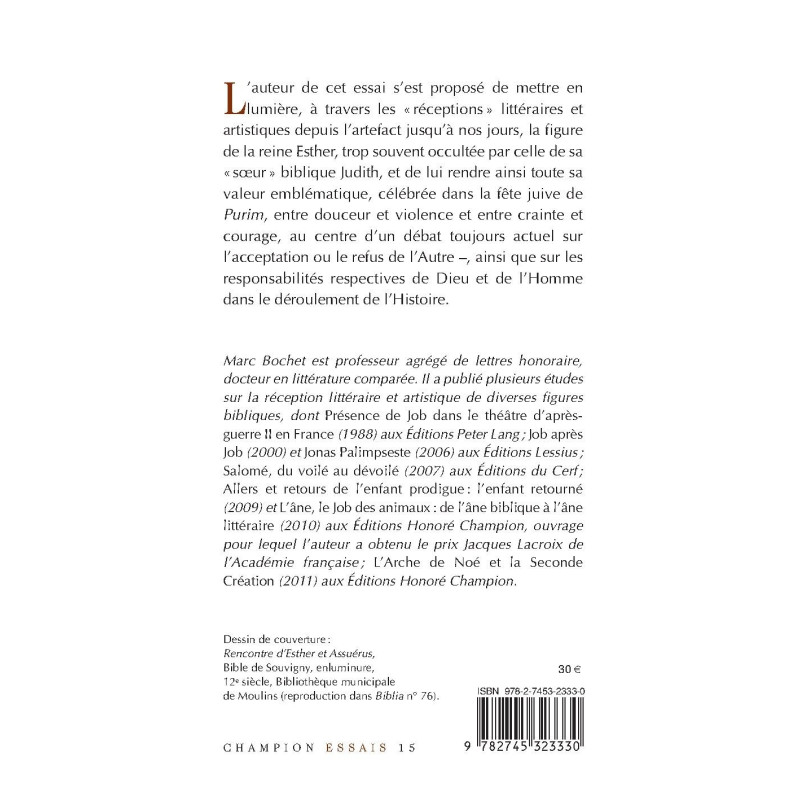 L’auteur de cet essai s’est proposé de mettre en lumière, à travers les « réceptions » littéraires et artistiques depuis l’artefact jusqu’à nos jours, la figure de la reine Esther, trop souvent occultée par celle de sa «sœur» biblique Judith, et de lui rendre ainsi toute sa valeur emblématique, célébrée dans la fête juive de Purim, entre douceur et violence et entre crainte et courage, au centre d’un débat toujours actuel sur l’acceptation ou le refus de l’Autre –, ainsi que sur les responsabilités respectives de Dieu et de l’Homme dans le déroulement de l’Histoire. Marc Bochet est professeur agrégé de lettres honoraire, docteur en littérature comparée. Il a publié plusieurs études sur la réception littéraire et artistique de diverses figures bibliques, dont Présence de Job dans le théâtre d’après-guerre II en France (1988) aux Éditions Peter Lang ; Job après Job (2000) et Jonas Palimpseste (2006) aux Éditions Lessius ; Salomé, du voilé au dévoilé (2007) aux Éditions du Cerf ; Allers et retours de l’enfant prodigue : l’enfant retourné (2009) et L’âne, le Job des animaux : de l’âne biblique à l’âne littéraire (2010) aux Éditions Honoré Champion, ouvrage pour lequel l’auteur a obtenu le prix Jacques Lacroix de l’Académie française ; L’Arche de Noé et la Seconde Création (2011) aux Éditions Honoré Champion.