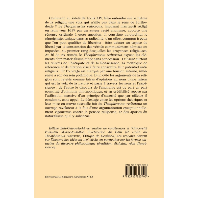 Comment, au siècle de Louis XIV, faire entendre sur le thème de la religion une voix qui n’aille pas dans le sens de l’orthodoxie ? Le Theophrastus redivivus, imposant manuscrit rédigé en latin vers 1659 par un auteur resté anonyme, apporte une réponse originale à cette question. Il constitue aujourd’hui le témoignage, unique dans sa radicalité, d’un effort commun à ceux que l’on peut qualifier de libertins : faire exister un espace de liberté par la contestation des vérités communément admises ou imposées, au premier rang desquelles les croyances religieuses. Au fil de six traités, le Theophrastus redivivus expose les éléments d’un matérialisme athée sans concession. Utilisant surtout les œuvres de l’Antiquité et de la Renaissance, sa technique de référence et de citation vise à faire apparaître leur potentiel antireligieux. Or l’ouvrage est marqué par une tension interne, inhérente à son dessein polémique. D’un côté les arguments de la religion sont rejetés comme fatras d’opinions au nom d’une raison qui est la voix de la nature et parle à travers les sens et l’expérience ; de l’autre le discours de l’anonyme est de part en part constitué d’opinions philosophiques, et sa crédibilité repose sur l’utilisation massive d’un principe d’autorité que par ailleurs il condamne sans appel. Le décalage entre les options théoriques et leur mise en oeuvre textuelle fait du Theophrastus redivivus un ouvrage révélateur à la fois d’une argumentation exceptionnellement vigoureuse contre la pensée religieuse, et des apories du naturalisme qu’il y substitue. Hélène Bah-Ostrowiecki est maître de conférences à l’Université Paris-Est Marne-la-Vallée. Traductrice du latin (6e traité du Theophrastus redivivus, Éthique de Geulincx) ses travaux portent sur l’histoire des idées au XVIIe siècle, en particulier sur les formes textuelles du discours philosophique (érudition, dialogue, récit d’expérience).