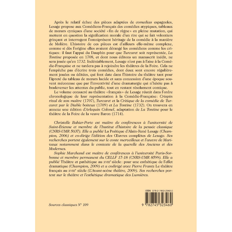 Après le relatif échec des pièces adaptées de comedias espagnoles, Lesage propose aux Comédiens-Français des comédies atypiques, tableaux de mœurs cyniques d’une société «fin de règne» en pleine mutation, qui mettent en question la signification morale d’un rire qui se fait volontiers grinçant et interrogent l’omniprésent héritage de la comédie à la manière de Molière. L’histoire de ces pièces est d’ailleurs elle-même complexe, comme si dès l’origine elles avaient dérangé les comédiens comme les critiques: il faut l’appui du Dauphin pour que Turcaret soit représentée, La Tontine proposée en 1708, et dont nous éditons un manuscrit inédit, ne sera jouée qu’en 1732. Indéniablement, Lesage n’est pas à l’aise à la Comédie- Française et ne tardera pas à rejoindre les théâtres de la Foire. Cela ne l’empêche pas d’écrire trois comédies, dont deux sont encore régulièrement jouées ou éditées, qui font date dans l’histoire du théâtre tant pour l’âpreté du tableau de mœurs lucide et sans concession d’une époque souvent méconnue que par l’inventivité d’une dramaturgie qui n’hésite pas à bouleverser les attentes du public, tout en restant résolument comique. Le volume consacré au théâtre «français» de Lesage réunit dans l’ordre chronologique de leur représentation à la Comédie-Française: Crispin rival de son maître (1707), Turcaret et la Critique de la comédie de Turcaret par le Diable boiteux (1709) et La Tontine (1732). On trouvera en annexe une édition d’Arlequin Colonel, adaptation de La Tontine pour le théâtre de la Foire de la veuve Baron (1714).