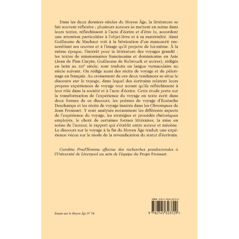 Dans les deux derniers siècles du Moyen Âge, la littérature se fait souvent réflexive ; plusieurs auteurs se mettent en scène dans leurs textes, réfléchissent à l’acte d’écrire et d’être lu, accordent une attention particulière à l’objet-livre et à sa matérialité. Ainsi Guillaume de Machaut voit à la fabrication d’un manuscrit rassemblant ses œuvres et à l’image qu’il projette de lui-même. À la même époque, l’intérêt pour la littérature des voyages grandit : les textes de missionnaires franciscains et dominicains en Asie (Jean de Plan Carpin, Guillaume de Rubrouck et autres), rédigés en latin au XIIIe siècle, sont traduits en langue vernaculaire au siècle suivant. On rédige aussi des récits de voyage et de pèlerinage en français. Au croisement de ces deux tendances se situe le discours sur le voyage, dans lequel des écrivains relatent leurs propres expériences de voyage tout autant qu’ils réfléchissent à leur rôle dans la société et à l’acte d’écrire. Cette étude porte sur la transformation de l’expérience du voyage en texte écrit dans deux formes de ce discours, les poèmes de voyage d’Eustache Deschamps et les récits de voyage insérés dans les Chroniques de Jean Froissart. Y sont analysés notamment les différents aspects de l’expérience du voyage, les stratégies et procédés rhétoriques employés, le choix de certaines formes littéraires, la mise en scène de l’auteur, le rapport qui s’établit entre auteur et mécène. Le discours sur le voyage à la fin du Moyen Âge traduit une expérience vécue sur le mode de la revendication du statut d’écrivain. Caroline Prud’Homme effectue des recherches postdoctorales à l’Université de Liverpool au sein de l’équipe du Projet Froissart.