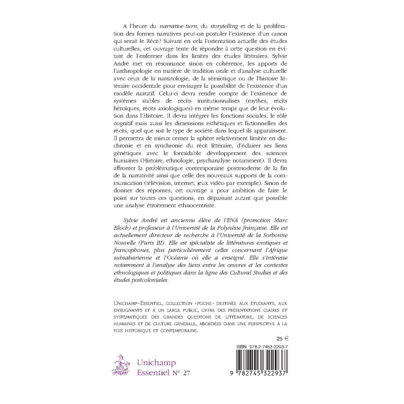 A l’heure du narrative turn, du storytelling et de la prolifération des formes narratives peut-on postuler l’existence d’un canon qui serait le Récit ? Suivant en cela l’orientation actuelle des études culturelles, cet ouvrage tente de répondre à cette question en évitant de l’enfermer dans les limites des études littéraires. Sylvie André met en résonnance sinon en cohérence, les apports de l’anthropologie en matière de tradition orale et d’analyse culturelle avec ceux de la narratologie, de la sémiotique ou de l’histoire littéraire occidentale pour envisager la possibilité de l’existence d’un modèle narratif. Celui-ci devra rendre compte de l’existence de systèmes stables de récits institutionnalisés (mythes, récits héroïques, récits axiologiques) en même temps que de leur évolution dans l’Histoire. Il devra intégrer les fonctions sociales, le rôle cognitif mais aussi les dimensions esthétiques et fictionnelles des récits, quel que soit le type de société dans lequel ils apparaissent. Il permettra de mieux cerner la sphère relativement limitée en diachronie et en synchronie du récit littéraire, d’éclairer ses liens génétiques avec le formidable développement des sciences humaines (Histoire, ethnologie, psychanalyse notamment). Il devra affronter la problématique contemporaine postmoderne de la fin de la narrativité ainsi que celle des nouveaux supports de la communication (télévision, internet, jeux vidéo par exemple). Sinon de donner des réponses, cet ouvrage a pour ambition de faire le point sur toutes ces questions, en dépassant autant que possible une analyse étroitement ethnocentriste.