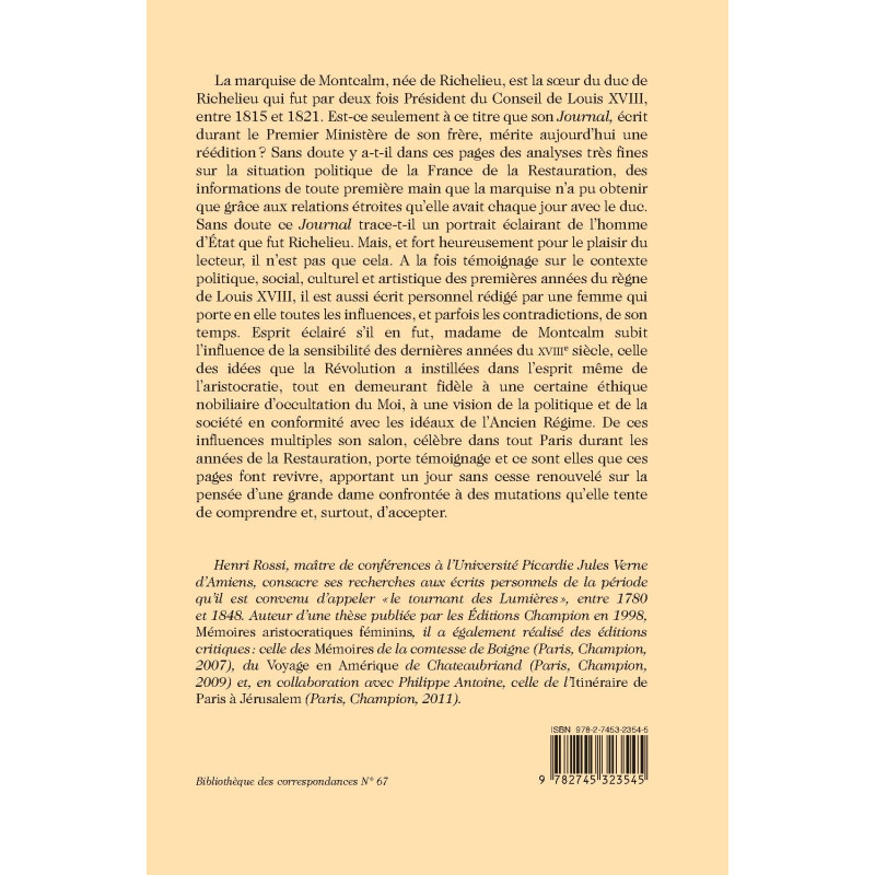 La marquise de Montcalm, née de Richelieu, est la sœur du duc de Richelieu qui fut par deux fois Président du Conseil de Louis XVIII, entre 1815 et 1821. Est-ce seulement à ce titre que son Journal, écrit durant le Premier Ministère de son frère, mérite aujourd’hui une réédition? Sans doute y a-t-il dans ces pages des analyses très fines sur la situation politique de la France de la Restauration, des informations de toute première main que la marquise n’a pu obtenir que grâce aux relations étroites qu’elle avait chaque jour avec le duc. Sans doute ce Journal trace-t-il un portrait éclairant de l’homme d’État que fut Richelieu. Mais, et fort heureusement pour le plaisir du lecteur, il n’est pas que cela. A la fois témoignage sur le contexte politique, social, culturel et artistique des premières années du règne de Louis XVIII, il est aussi écrit personnel rédigé par une femme qui porte en elle toutes les influences, et parfois les contradictions, de son temps. Esprit éclairé s’il en fut, madame de Montcalm subit l’influence de la sensibilité des dernières années du XVIIIe siècle, celle des idées que la Révolution a instillées dans l’esprit même de l’aristocratie, tout en demeurant fidèle à une certaine éthique nobiliaire d’occultation du Moi, à une vision de la politique et de la société en conformité avec les idéaux de l’Ancien Régime. De ces influences multiples son salon, célèbre dans tout Paris durant les années de la Restauration, porte témoignage et ce sont elles que ces pages font revivre, apportant un jour sans cesse renouvelé sur la pensée d’une grande dame confrontée à des mutations qu’elle tente de comprendre et, surtout, d’accepter.
