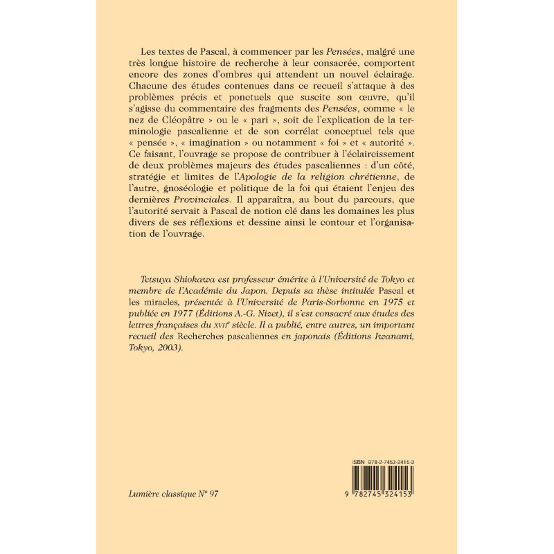 Les textes de Pascal, à commencer par les Pensées, malgré une très longue histoire de recherche à leur consacrée, comportent encore des zones d’ombres qui attendent un nouvel éclairage. Chacune des études contenues dans ce recueil s’attaque à des problèmes précis et ponctuels que suscite son oeuvre, qu’il s’agisse du commentaire des fragments des Pensées, comme « le nez de Cléopâtre » ou le « pari », soit de l’explication de la terminologie pascalienne et de son corrélat conceptuel tels que « pensée », « imagination » ou notamment « foi » et « autorité ». Ce faisant, l’ouvrage se propose de contribuer à l’éclaircissement de deux problèmes majeurs des études pascaliennes : d’un côté, stratégie et limites de l’Apologie de la religion chrétienne, de l’autre, gnoséologie et politique de la foi qui étaient l’enjeu des dernières Provinciales. Il apparaîtra, au bout du parcours, que l’autorité servait à Pascal de notion clé dans les domaines les plus divers de ses réflexions et dessine ainsi le contour et l’organisation de l’ouvrage.