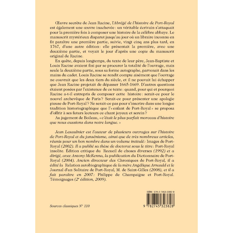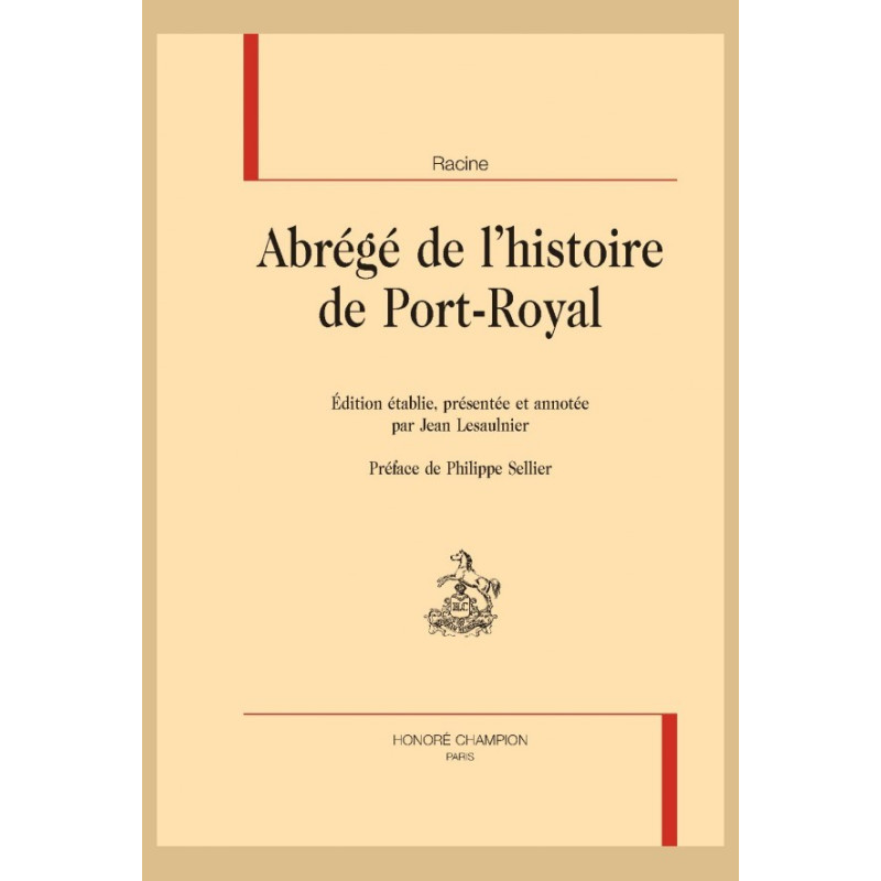 Œuvre secrète de Jean Racine, l’Abrégé de l’histoire de Port-Royal est également une œuvre inachevée : un véritable écrivain s’attaquait pour la première fois à composer une histoire de la célèbre abbaye. Le manuscrit mystérieux disparut jusqu’au jour où un libraire inconnu en fit paraître une première partie, suivie, vingt cinq ans plus tard, en 1767, d’une autre édition : elle présentait la première, avec une deuxième partie, et voyait le jour d’après une copie du manuscrit original de Racine. En quête, depuis longtemps, du texte de leur père, Jean-Baptiste et Louis Racine avaient fini par se procurer la totalité de l’ouvrage, mais seule la deuxième partie, sous sa forme autographe, parvenait dans les mains du cadet. Louis Racine se rendit compte aisément que l’ouvrage ne couvrait que les deux tiers du siècle, et il ne pouvait lui échapper que Jean Racine projetait de dépasser 1665-1669. D’autres questions étaient posées par l’existence de ce texte : quand, pour qui et pourquoi Racine a-t-il entrepris de composer cette histoire : serait-ce pour le nouvel archevêque de Paris? Serait-ce pour présenter une apologie pieuse de Port-Royal? Ne serait-ce pas pour s’inscrire dans une longue tradition historiographique que l’« enfant de Port-Royal » se proposa d’offrir à ses futurs lecteurs ce chant joyeux et serein ? Au jugement de Boileau, « c’était le plus parfait morceau d’histoire que nous eussions dans notre langue. »