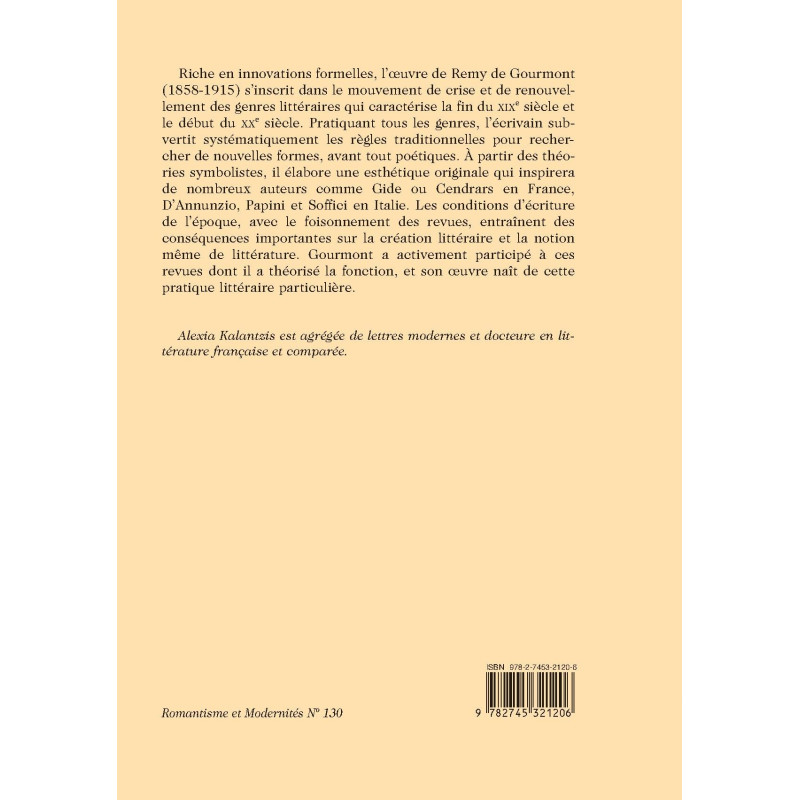 Riche en innovations formelles, l’œuvre de Remy de Gourmont (1858-1915) s’inscrit dans le mouvement de crise et de renouvellement des genres littéraires qui caractérise la fin du XIXe siècle et le début du XXe siècle. Pratiquant tous les genres, l’écrivain subvertit systématiquement les règles traditionnelles pour rechercher de nouvelles formes, avant tout poétiques. À partir des théories symbolistes, il élabore une esthétique originale qui inspirera de nombreux auteurs comme Gide ou Cendrars en France, D’Annunzio, Papini et Soffici en Italie. Les conditions d’écriture de l’époque, avec le foisonnement des revues, entraînent des conséquences importantes sur la création littéraire et la notion même de littérature. Gourmont a activement participé à ces revues dont il a théorisé la fonction, et son oeuvre naît de cette pratique littéraire particulière.