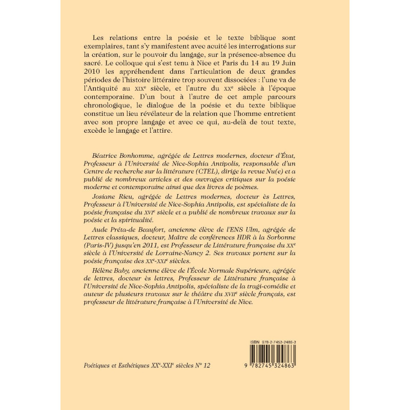 Les relations entre la poésie et le texte biblique sont exemplaires, tant s’y manifestent avec acuité les interrogations sur la création, sur le pouvoir du langage, sur la présence-absence du sacré. Le colloque qui s’est tenu à Nice et Paris du 14 au 19 Juin 2010 les appréhendent dans l’articulation de deux grandes périodes de l’histoire littéraire trop souvent dissociées : l’une va de l’Antiquité au XIXe siècle, et l’autre du XXe siècle à l’époque contemporaine. D’un bout à l’autre de cet ample parcours chronologique, le dialogue de la poésie et du texte biblique constitue un lieu révélateur de la relation que l’homme entretient avec son propre langage et avec ce qui, au-delà de tout texte, excède le langage et l’attire.