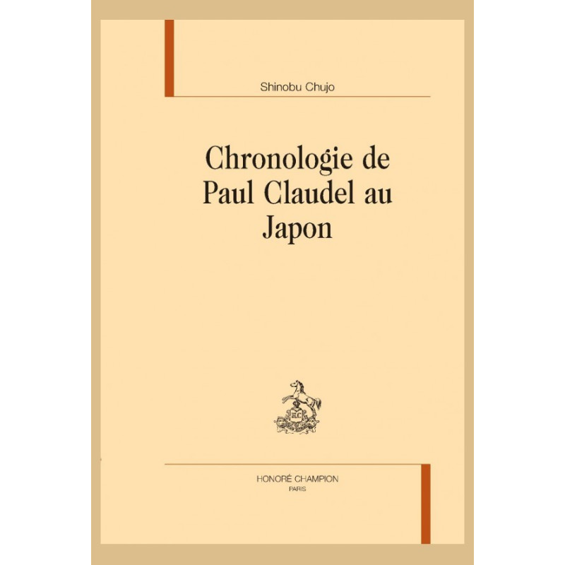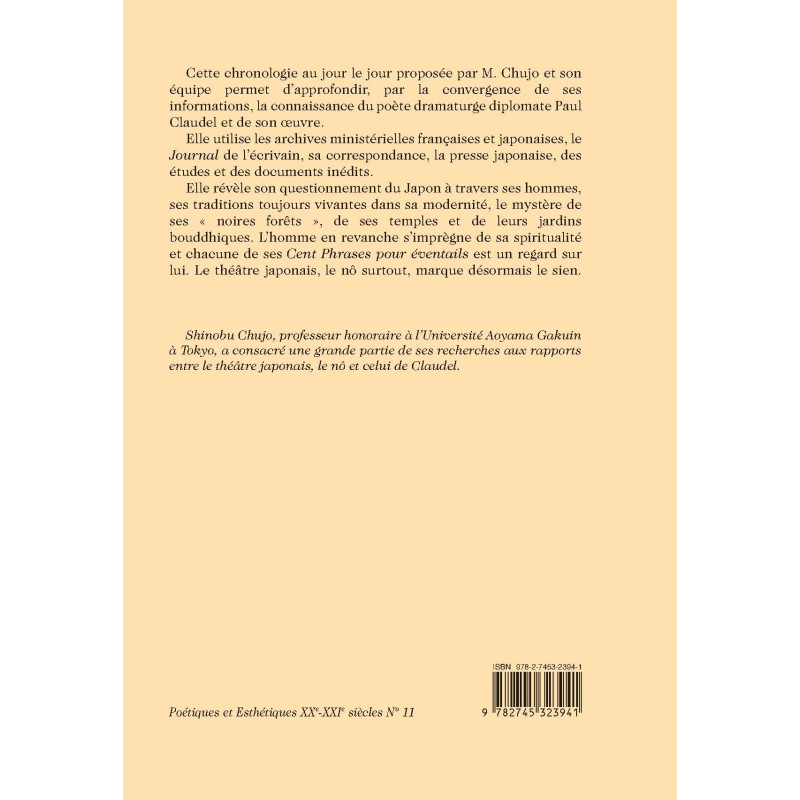Cette chronologie au jour le jour proposée par M. Chujo et son équipe permet d’approfondir, par la convergence de ses informations, la connaissance du poète dramaturge diplomate Paul Claudel et de son œuvre. Elle utilise les archives ministérielles françaises et japonaises, le Journal de l’écrivain, sa correspondance, la presse japonaise, des études et des documents inédits. Elle révèle son questionnement du Japon à travers ses hommes, ses traditions toujours vivantes dans sa modernité, le mystère de ses « noires forêts », de ses temples et de leurs jardins bouddhiques. L’homme en revanche s’imprègne de sa spiritualité et chacune de ses Cent Phrases pour éventails est un regard sur lui. Le théâtre japonais, le nô surtout, marque désormais le sien. Shinobu Chujo, professeur honoraire à l’Université Aoyama Gakuin à Tokyo, a consacré une grande partie de ses recherches aux rapports entre le théâtre japonais, le nô et celui de Claudel.
