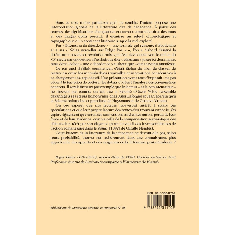 Sous ce titre moins paradoxal qu`il ne semble, l`auteur propose une interprétation globale de la littérature dite de décadence. À partir des œuvres, des significations changeantes et souvent contradictoires des mots et des images qu`ils portent, il esquisse un relevé chronologique et topographique d`un continent littéraire jusque-là mal exploré. Par « littérature de décadence » – une formule qui remonte à Baudelaire et à ses « Notes nouvelles sur Edgar Poe » –, l`on a d`abord désigné la littérature nouvelle et révolutionnaire qui s`est développée vers le milieu du XIXe siècle par opposition à l`esthétique dite « classique » jusqu`ici dominante, mais dont l`échec – une « décadence » authentique – était devenu manifeste. Ce par quoi il fallait commencer, c`était tâcher de trier, de classer, de mettre en ordre les innombrables trouvailles et innovations consécutives à ce changement de cap décisif. Une précaution avant tout s`imposait : ne pas céder à la tentation de préférer les débats d`idées à l`analyse des phénomènes concrets. Il serait fâcheux par exemple que le lecteur – et le commentateur – ne tinssent pas compte du fait que la Salomé d`Oscar Wilde ressemble davantage à ses sœurs homonymes chez Jules Laforgue et Jean Lorrain qu`à la Salomé redoutable et grandiose de Huysmans et de Gustave Moreau. On ose espérer que nos lecteurs trouveront intérêt à suivre ces spéculations et que leur propre lecture des textes s`en trouvera enrichie. On espère également que certaines conventions anciennes auront perdu de leur force et de leur évidence, comme celle de la compensation automatique des défauts d`un récit par son élégance (ainsi en va-t-il des invraisemblances de l`action romanesque dans le Zohar [1892] de Catulle Mendès). Cette histoire de la littérature de la décadence ne devrait-elle pas, selon toute probabilité, trouver son achèvement dans une connaissance plus approfondie des apports et des exigences de la littérature post-décadente ?
