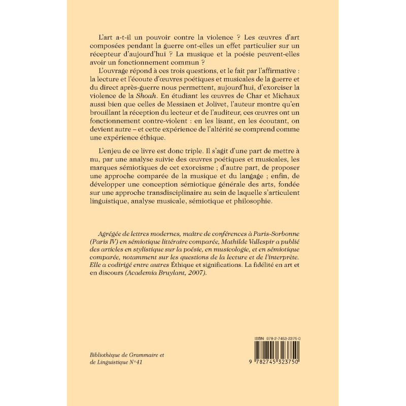 L’art a-t-il un pouvoir contre la violence ? Les oeuvres d’art composées pendant la guerre ont-elles un effet particulier sur un récepteur d’aujourd’hui ? La musique et la poésie peuvent-elles avoir un fonctionnement commun ? L’ouvrage répond à ces trois questions, et le fait par l’affirmative : la lecture et l’écoute d’œuvres poétiques et musicales de la guerre et du direct après-guerre nous permettent, aujourd’hui, d’exorciser la violence de la Shoah. En étudiant les œuvres de Char et Michaux aussi bien que celles de Messiaen et Jolivet, l’auteur montre qu’en brouillant la réception du lecteur et de l’auditeur, ces œuvres ont un fonctionnement contre-violent : en les lisant, en les écoutant, on devient autre – et cette expérience de l’altérité se comprend comme une expérience éthique. L’enjeu de ce livre est donc triple. Il s’agit d’une part de mettre à nu, par une analyse suivie des œuvres poétiques et musicales, les marques sémiotiques de cet exorcisme ; d’autre part, de proposer une approche comparée de la musique et du langage ; enfin, de développer une conception sémiotique générale des arts, fondée sur une approche transdisciplinaire au sein de laquelle s’articulent linguistique, analyse musicale, sémiotique et philosophie.