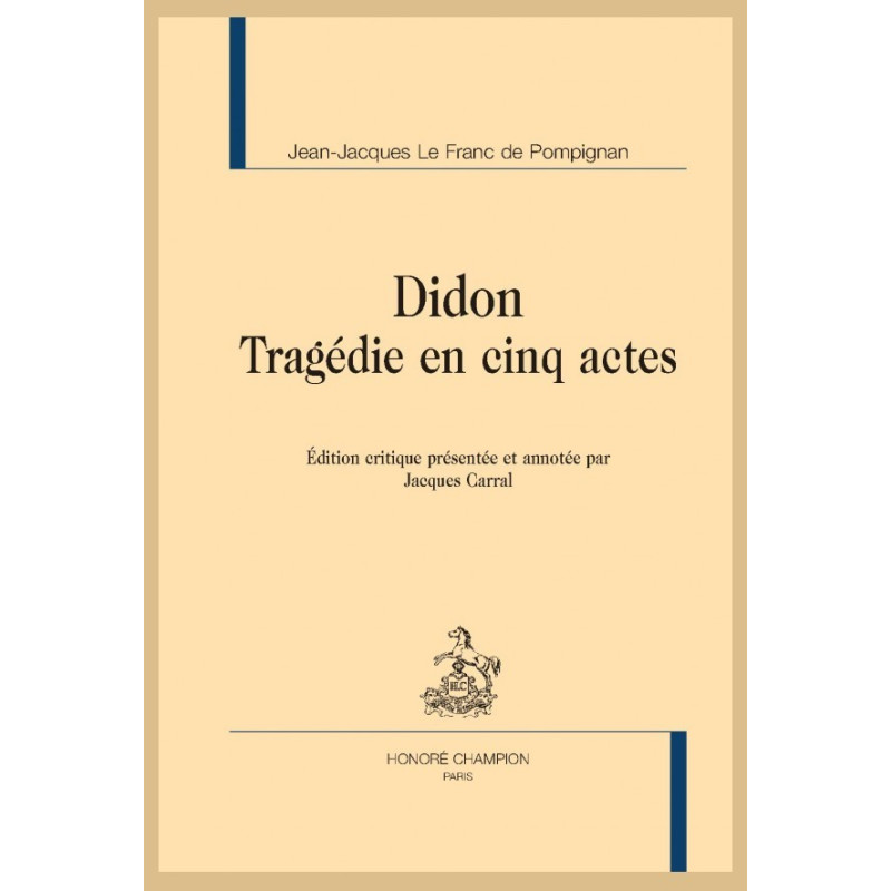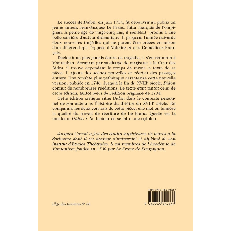 Le succès de Didon, en juin 1734, fit découvrir au public un jeune auteur, Jean-Jacques Le Franc, futur marquis de Pompignan. À peine âgé de vingt-cinq ans, il semblait promis à une belle carrière d’auteur dramatique. Il proposa, l’année suivante deux nouvelles tragédies qui ne purent être créées en raison d’un différend qui l’opposa à Voltaire et aux Comédiens-Français. Décidé à ne plus jamais écrire de tragédie, il s’en retourna à Montauban. Accaparé par sa charge de magistrat à la Cour des Aides, il trouva cependant le temps de revoir le texte de sa pièce. Il ajouta des scènes nouvelles et récrivit des passages entiers. Une tonalité plus pathétique caractérise cette nouvelle version, publiée en 1746. Jusqu’à la fin du XVIIIe siècle, Didon connut de nombreuses rééditions. Le texte était tantôt celui de cette édition, tantôt celui de l’édition originale de 1734. Cette édition critique situe Didon dans le contexte personnel de son auteur et l’histoire du théâtre du XVIIIe siècle. En comparant les deux versions de cette pièce, elle met en lumière la qualité du travail de récriture de Le Franc. Quelle est la meilleure Didon ? Au lecteur de se faire une opinion.