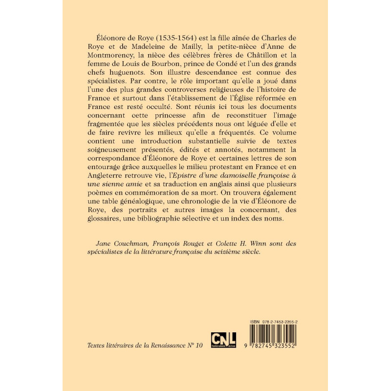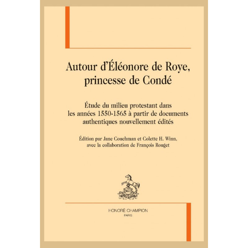 Éléonore de Roye (1535-1564) est la fille aînée de Charles de Roye et de Madeleine de Mailly, la petite-nièce d’Anne de Montmorency, la nièce des célèbres frères de Châtillon et la femme de Louis de Bourbon, prince de Condé et l’un des grands chefs huguenots. Son illustre descendance est connue des spécialistes. Par contre, le rôle important qu’elle a joué dans l’une des plus grandes controverses religieuses de l’histoire de France et surtout dans l’établissement de l’Église réformée en France est resté occulté. Sont réunis ici tous les documents concernant cette princesse afin de reconstituer l’image fragmentée que les siècles précédents nous ont léguée d’elle et de faire revivre les milieux qu’elle a fréquentés. Ce volume contient une introduction substantielle suivie de textes soigneusement présentés, édités et annotés, notamment la correspondance d’Éléonore de Roye et certaines lettres de son entourage grâce auxquelles le milieu protestant en France et en Angleterre retrouve vie, l’Epistre d’une damoiselle françoise à une sienne amie et sa traduction en anglais ainsi que plusieurs poèmes en commémoration de sa mort. On trouvera également une table généalogique, une chronologie de la vie d’Éléonore de Roye, des portraits et autres images la concernant, des glossaires, une bibliographie sélective et un index des noms.