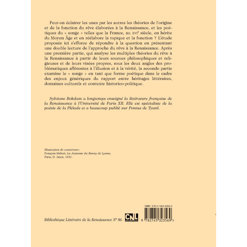Peut-on éclairer les unes par les autres les théories de l`origine et de la fonction du rêve élaborées à la Renaissance, et les poétiques du « songe » telles que la France, au XVIe siècle, en hérite du Moyen Âge et en réélabore la topique et la fonction ? L’étude proposée ici s’efforce de répondre à la question en présentant une double lecture de l’approche du rêve à la Renaissance. Après une première partie, qui analyse les multiples théories du rêve à la Renaissance à partir de leurs sources philosophiques et religieuses et de leurs visées propres, sous les deux angles des problématiques afférentes à l’illusion et à la vérité, la seconde partie examine le « songe » en tant que forme poétique dans le cadre des enjeux génériques du rapport entre héritages littéraires, domaines culturels et contexte historico-politique.